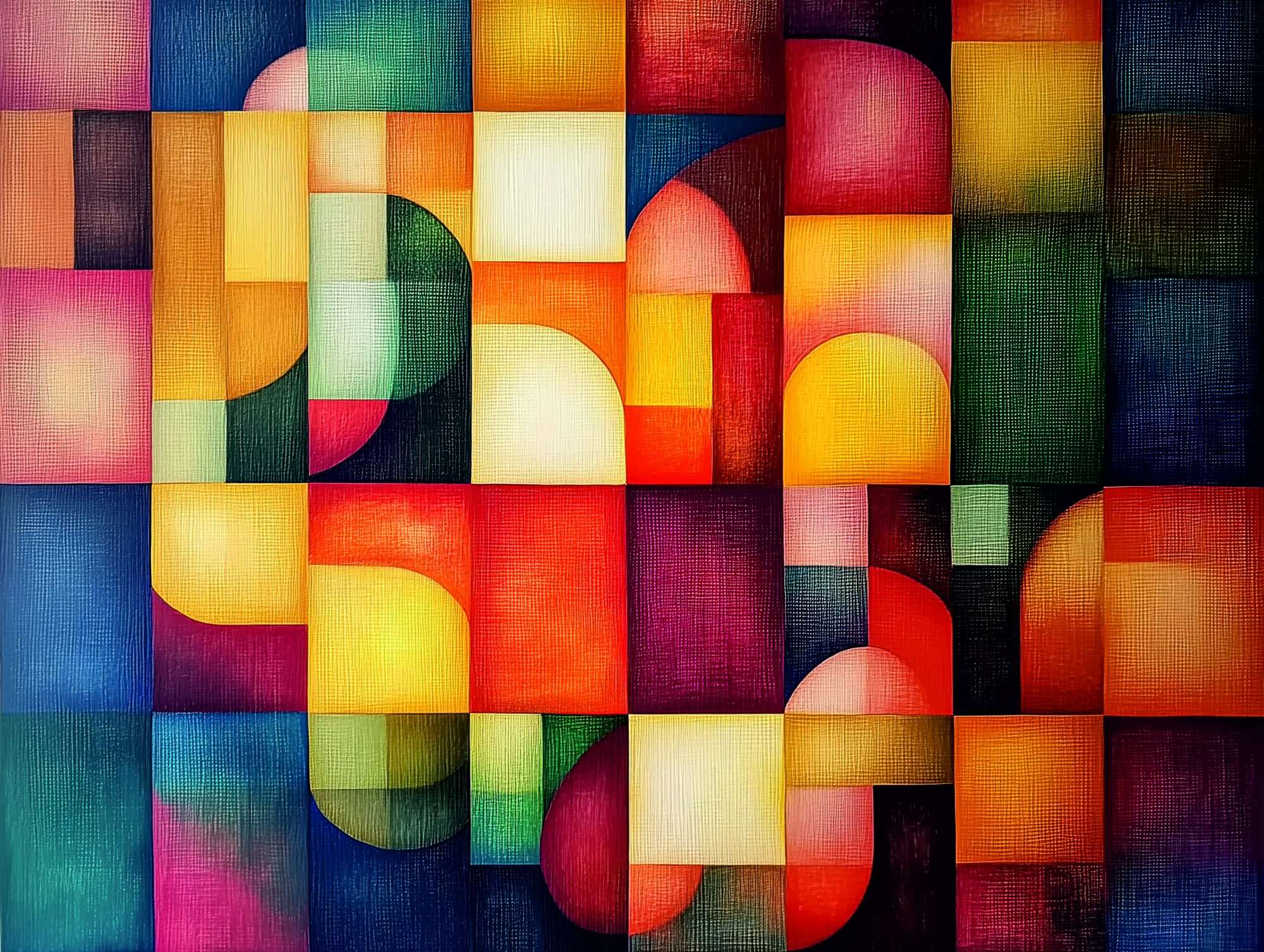 Dit fotobehang toont een abstract patroon opgebouwd uit geometrische vormen die samen een kleurrijk raster vormen. De compositie bestaat uit verschillende rechthoeken, halve cirkels en afgeronde vormen die strak tegen elkaar zijn geplaatst.