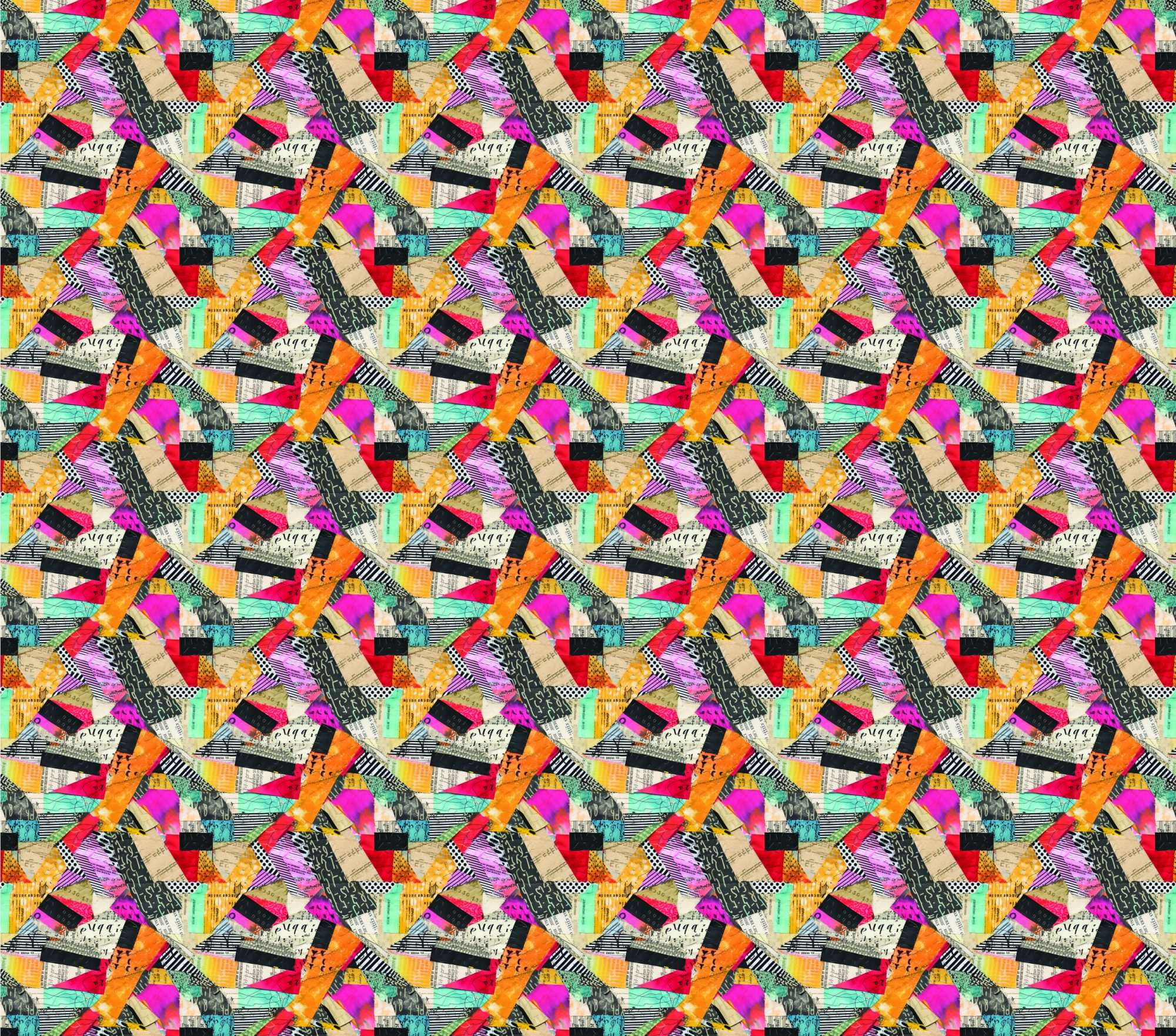Dit fotobehang abstract kleuren collage toont een dynamisch patroon van overlappende grafische vormen en texturen. De compositie bestaat uit verschillende vlakken die als een collage over elkaar zijn geplaatst. Hierdoor ontstaat een beeld waarin kleur, vorm en structuur samen een gelaagde visuele ervaring creëren.