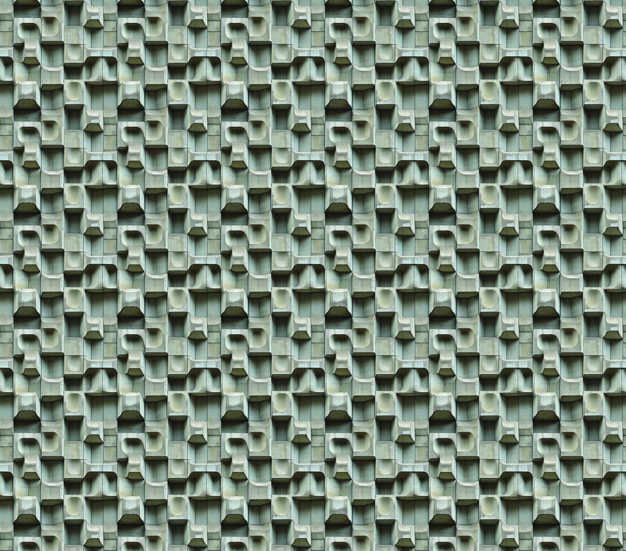 De betontextuur heeft een matte grijstint met subtiele kleurnuances. Deze variaties zorgen ervoor dat het oppervlak realistisch oogt en extra diepte krijgt. Het licht beweegt langs de afgeronde vormen waardoor zachte schaduwen ontstaan. Hierdoor wordt het reliëf duidelijk zichtbaar zonder harde contrasten.