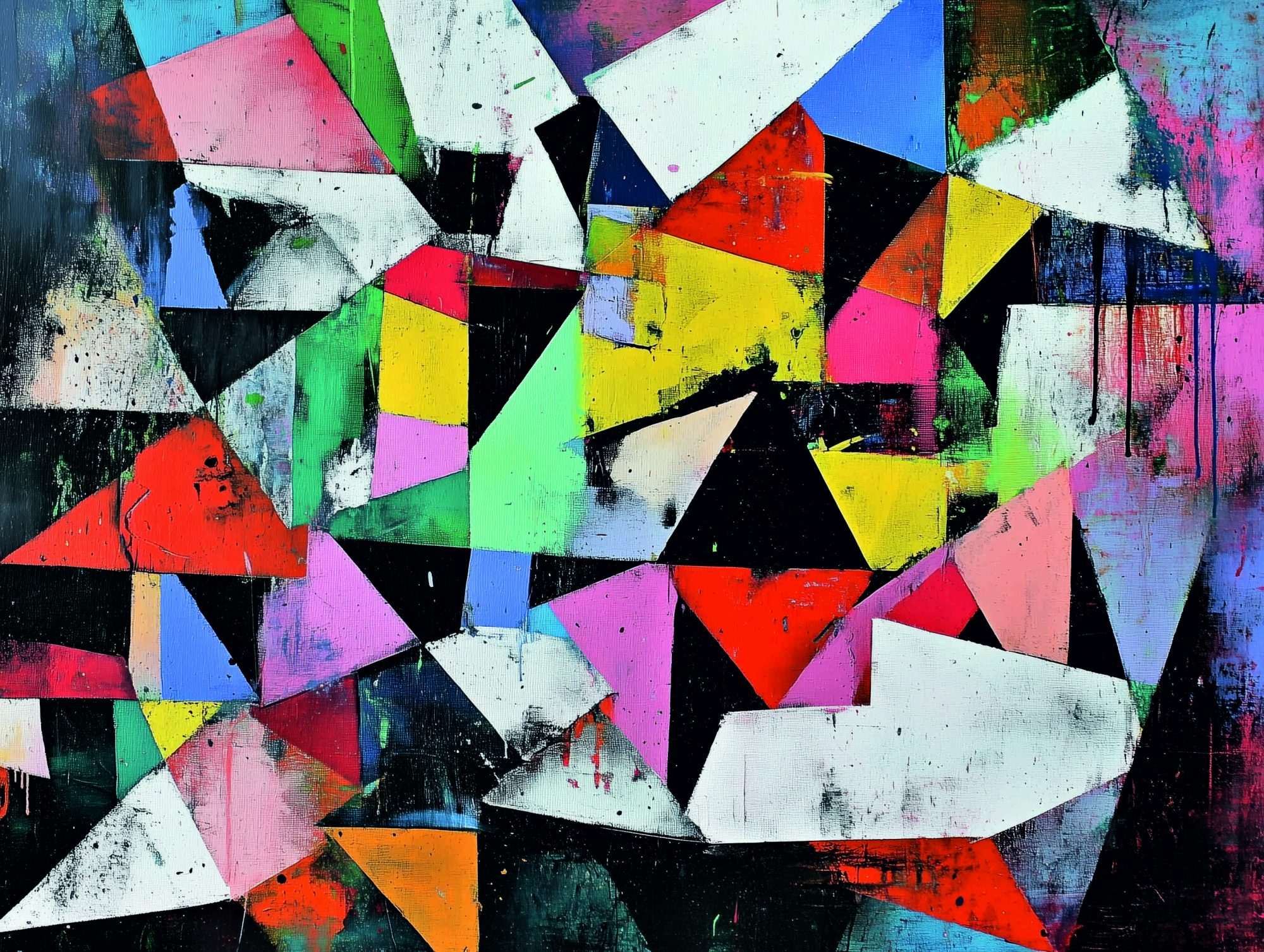 De vormen zijn verspreid over het beeld en hebben scherpe hoeken en diagonale lijnen. Hierdoor ontstaat een dynamisch patroon waarin de verschillende elementen elkaar overlappen en verbinden.