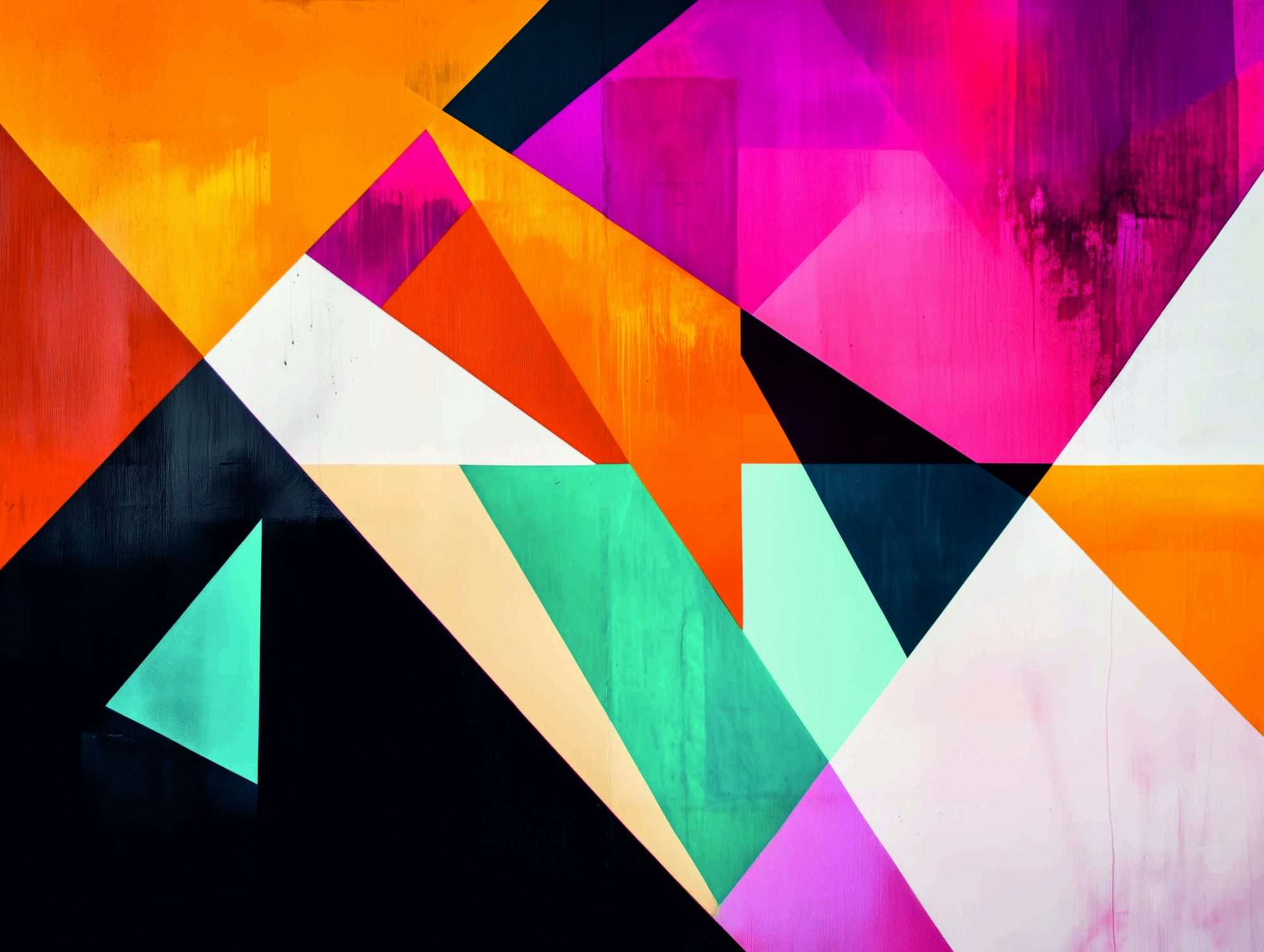 Dit fotobehang toont een abstract kunstwerk opgebouwd uit een dynamische combinatie van geometrische vormen en contrasterende kleurvlakken. De compositie bestaat uit driehoeken, diagonale lijnen en scherpe vlakken die elkaar kruisen en overlappen. Hierdoor ontstaat een visueel sterk beeld met een duidelijke grafische structuur.