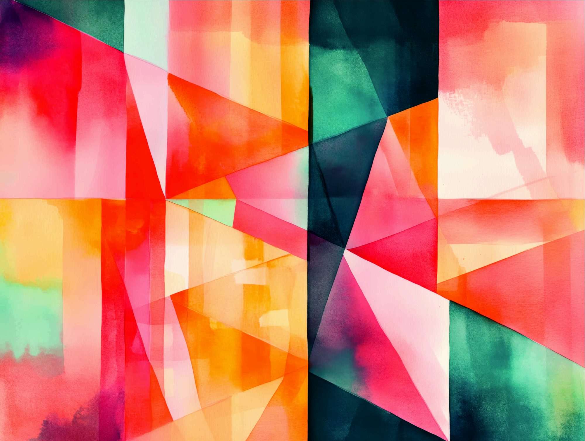 De vormen zijn opgebouwd uit driehoeken en diagonale vlakken die verspreid over het beeld zijn geplaatst. Sommige delen zijn scherp en duidelijk zichtbaar terwijl andere elementen vervagen in een zachte kleurverloop. Hierdoor ontstaat een speels contrast tussen structuur en kleur.