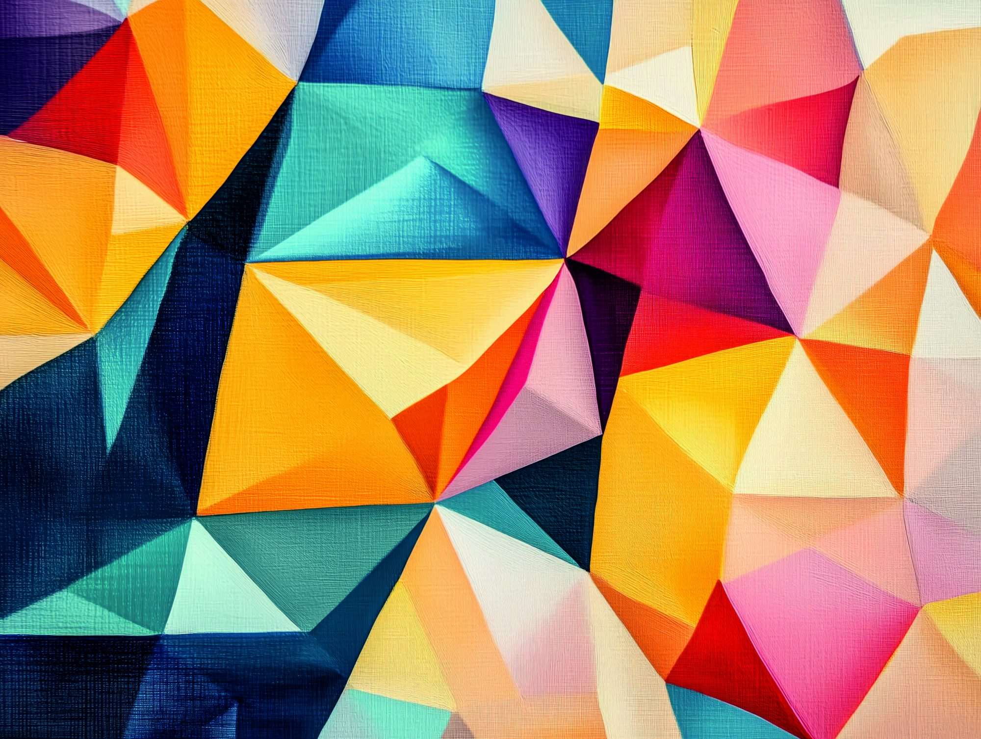 Dit fotobehang toont een abstract kunstwerk opgebouwd uit meerdere polygonale vormen die samen een kleurrijk geheel vormen. De compositie bestaat uit scherpe driehoeken en vlakken die op verschillende manieren in elkaar overlopen.