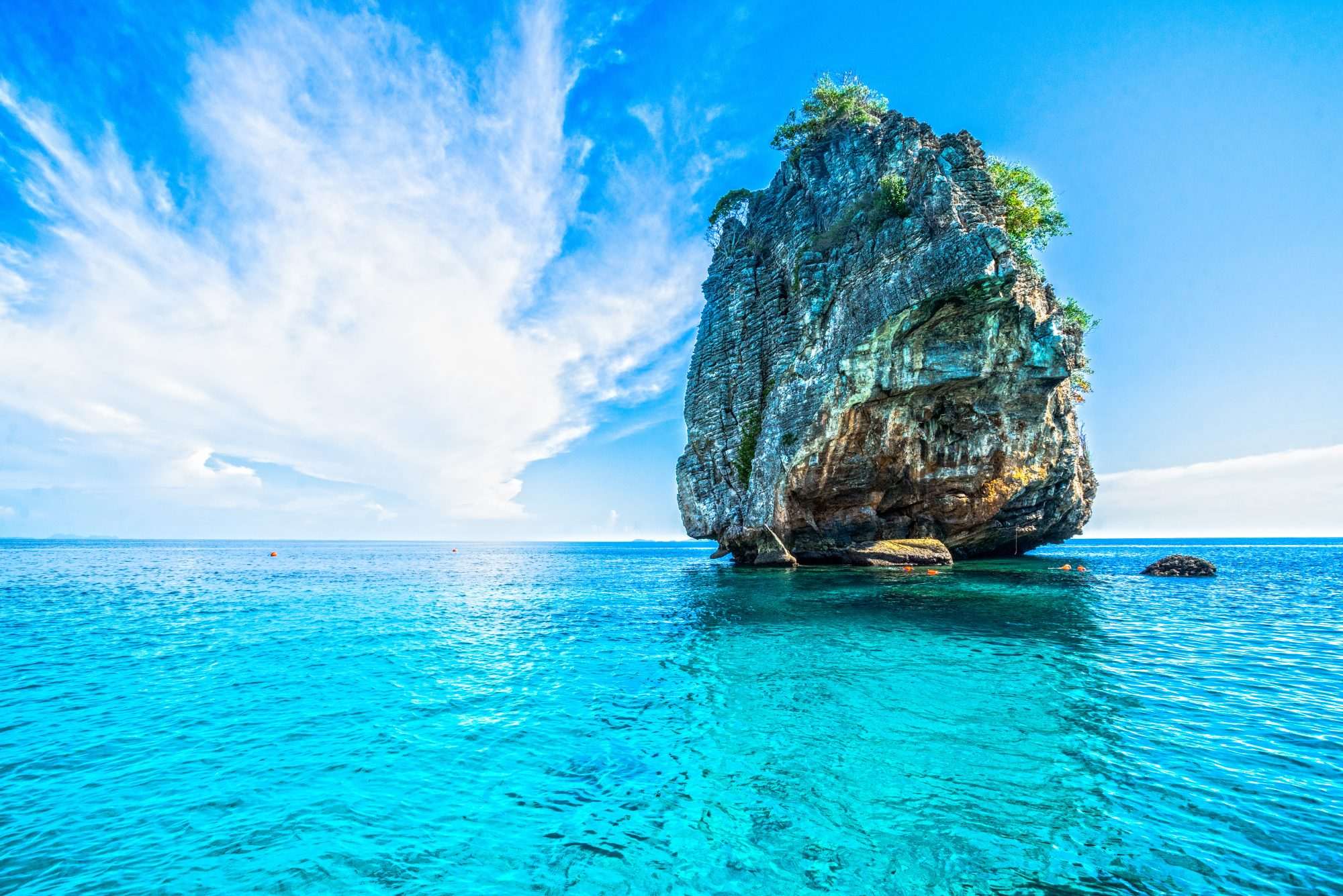 Dit fotobehang toont een imposante rotsformatie die oprijst uit een kalme, helderblauwe zee. De compositie is sterk gecentreerd, waarbij de rots als dominant verticaal element midden in het beeld staat. De horizon ligt relatief laag, waardoor de lucht een ruime rol krijgt in het totaalbeeld. Deze opbouw zorgt voor balans tussen massa en openheid, met een duidelijke focus op de natuurlijke structuur van de rots.