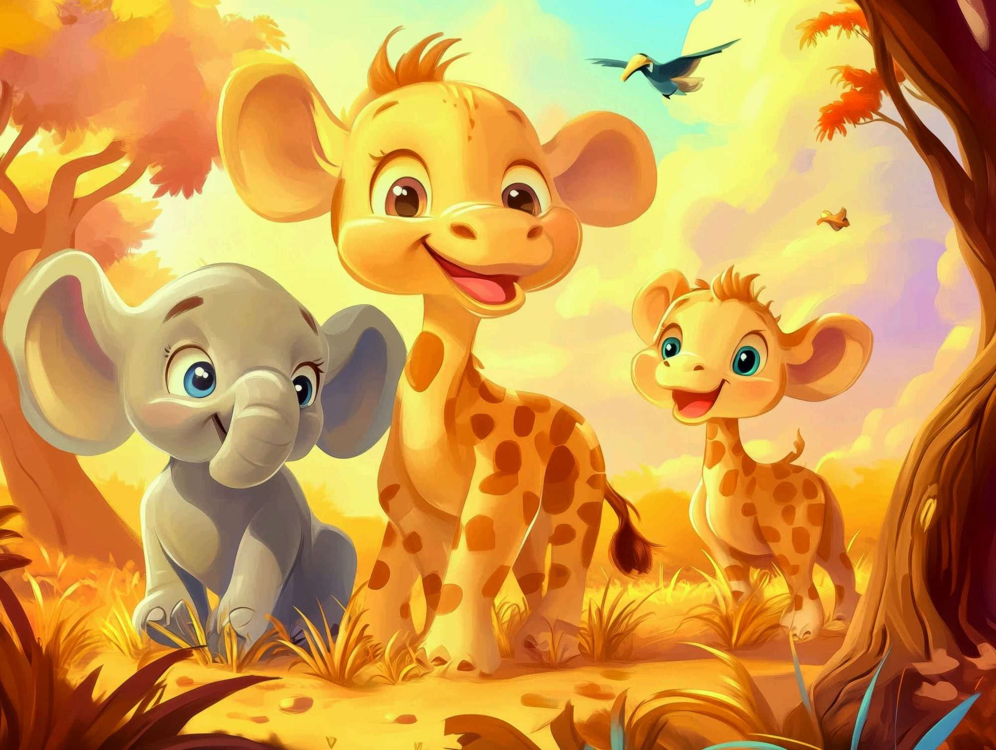 Dit fotobehang baby safari dieren vrolijk kinderkamer toont een kleurrijke illustratie van jonge safaridieren die samen in een warm landschap staan. De compositie bestaat uit een open plek met bomen en zachte bladeren die het beeld omlijsten. In het midden staan een olifant, giraffe en andere dieren dicht bij elkaar.