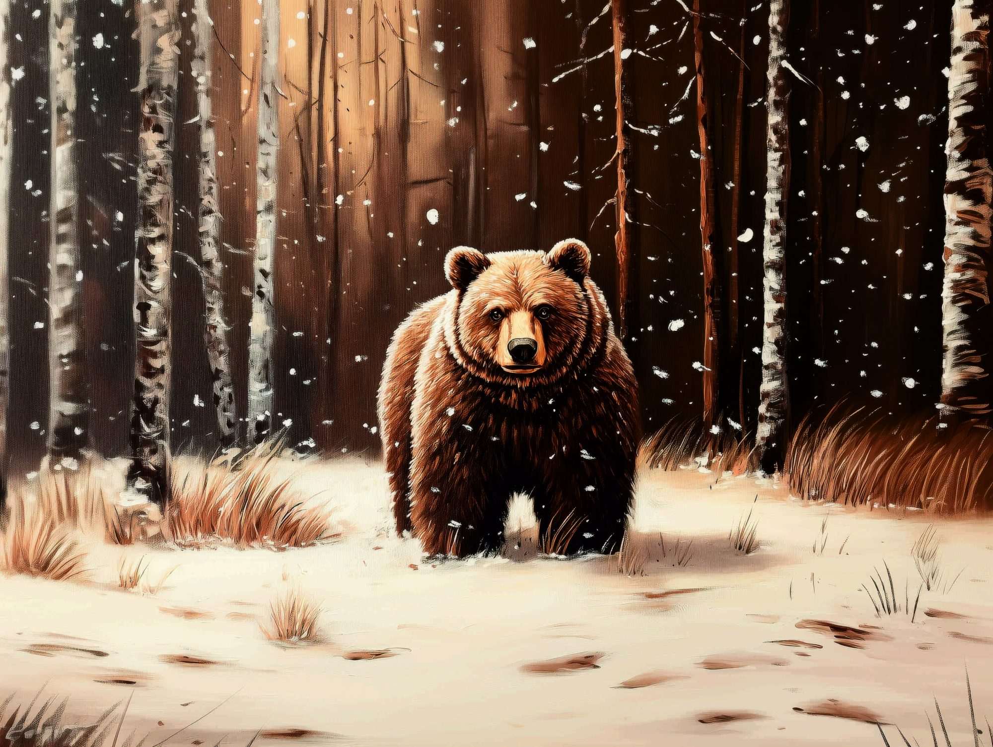 In een kinderkamer kan deze scène een stoere en avontuurlijke sfeer creëren. De beer wordt op een rustige manier weergegeven waardoor het dier indrukwekkend maar vriendelijk oogt.