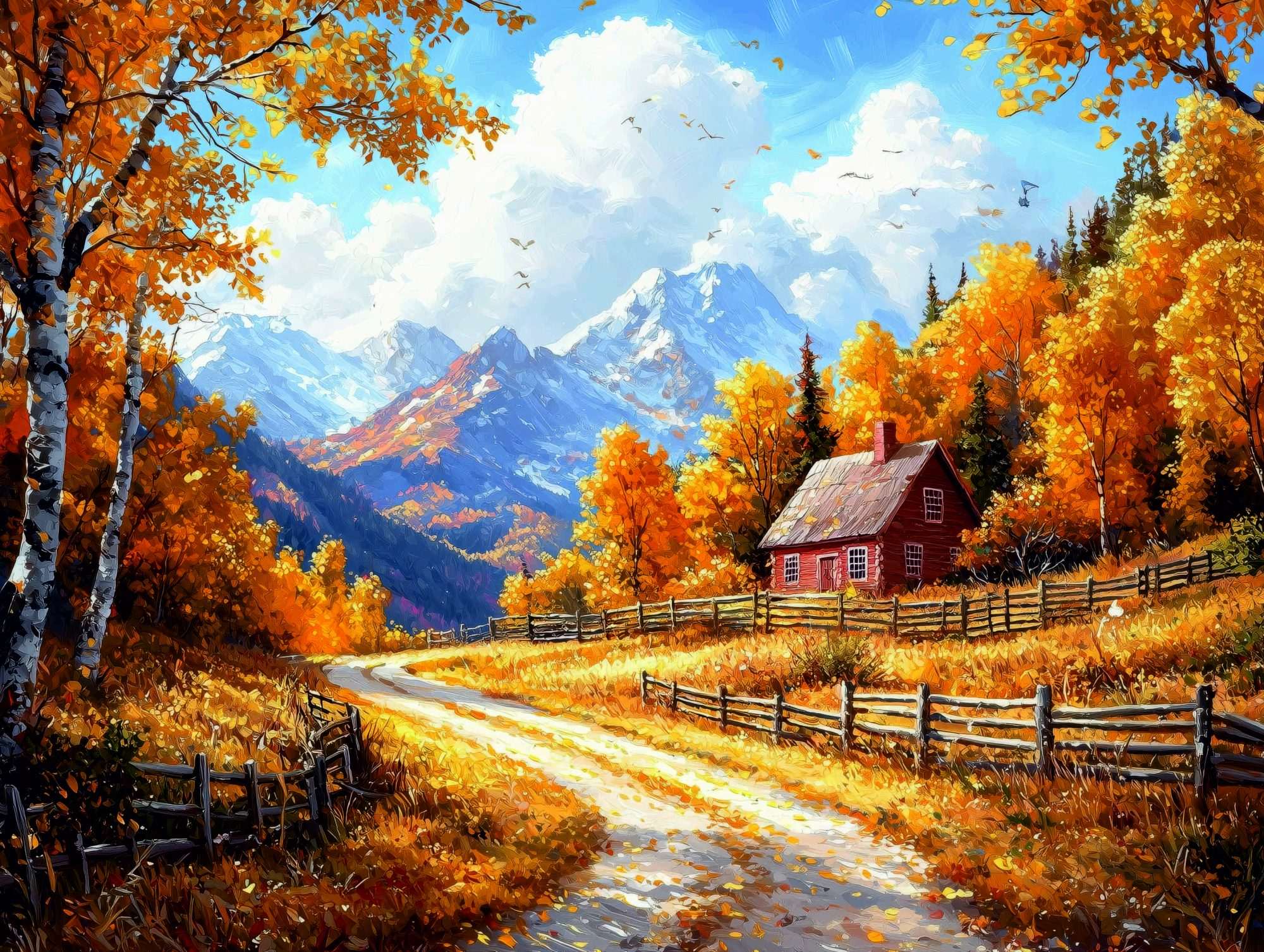 Het kleurgebruik combineert warme herfsttinten met koele berg- en luchttinten. Dit zorgt voor balans.
