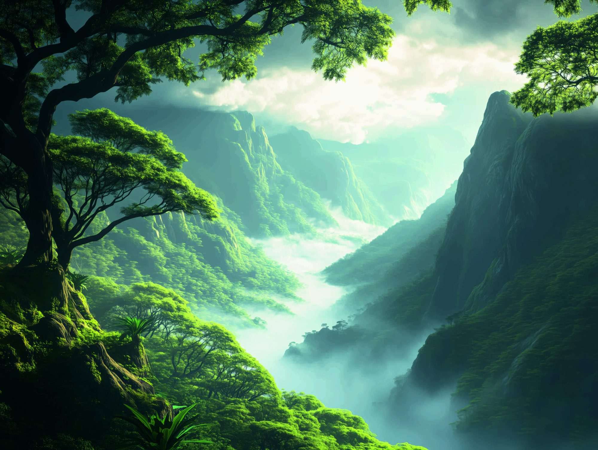 Dit landschap fotobehang combineert bergvallei, stromend water en natuurlijke diepte in een ruimtelijk wandontwerp.