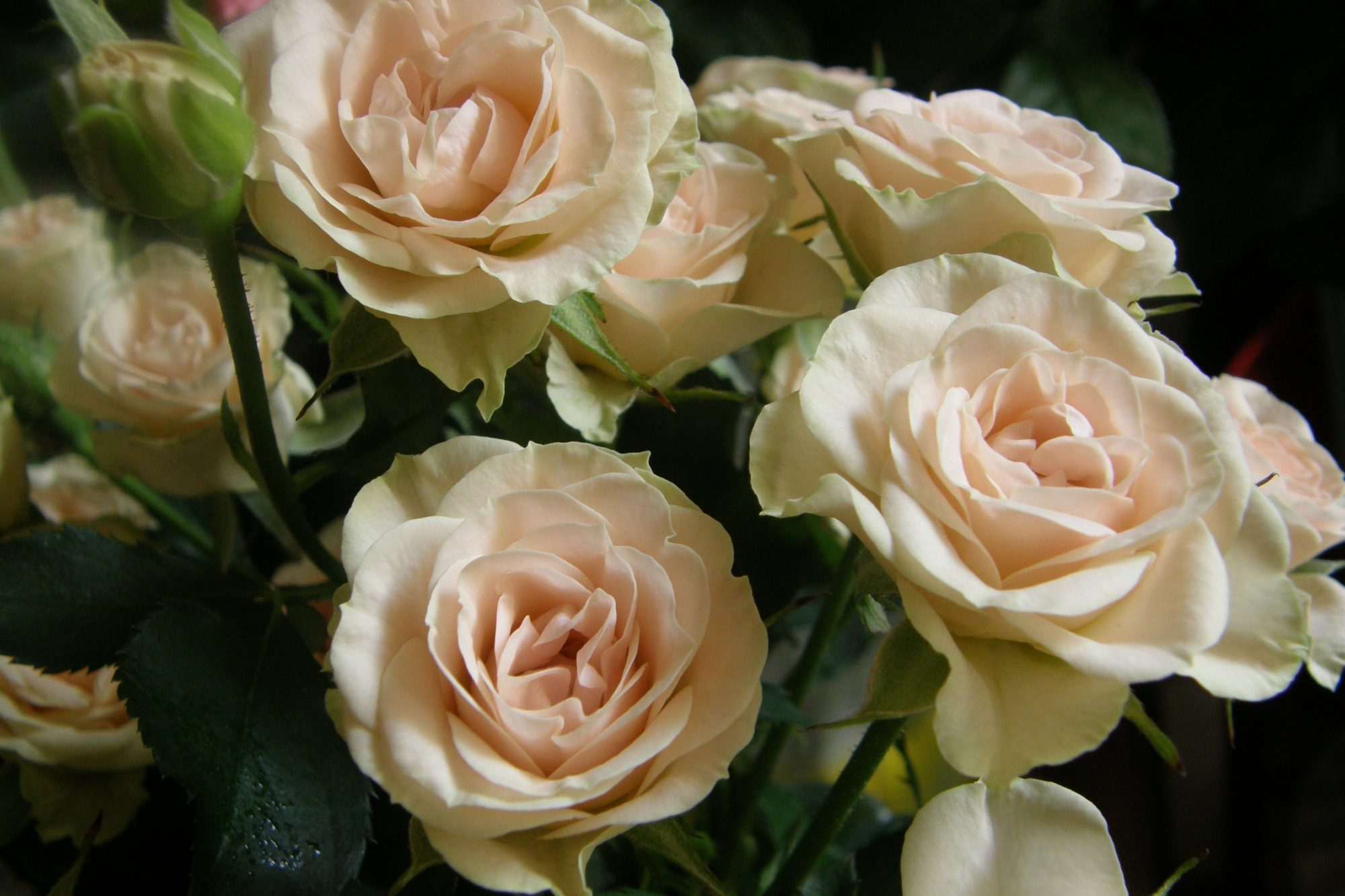 Door de verschillende posities van de bloemen ontstaat een gelaagde compositie. Sommige rozen bevinden zich op de voorgrond terwijl andere gedeeltelijk verborgen zijn tussen de bladeren.