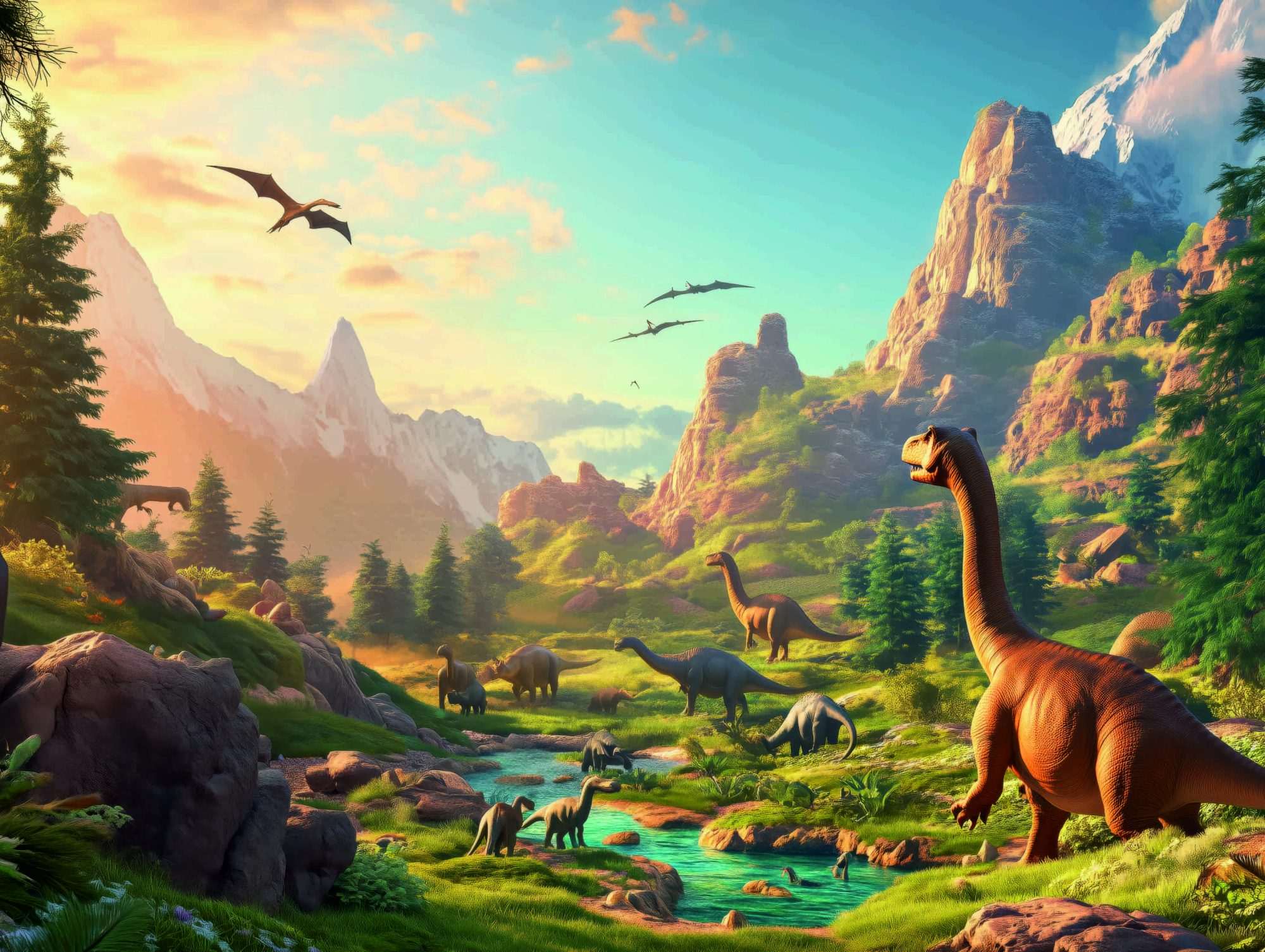De dinosaurusfiguren zijn verspreid over het landschap en zorgen voor een speels element in de scène. De rivier leidt de blik door het beeld richting de bergen in de achtergrond. Hierdoor ontstaat een sterk perspectief.