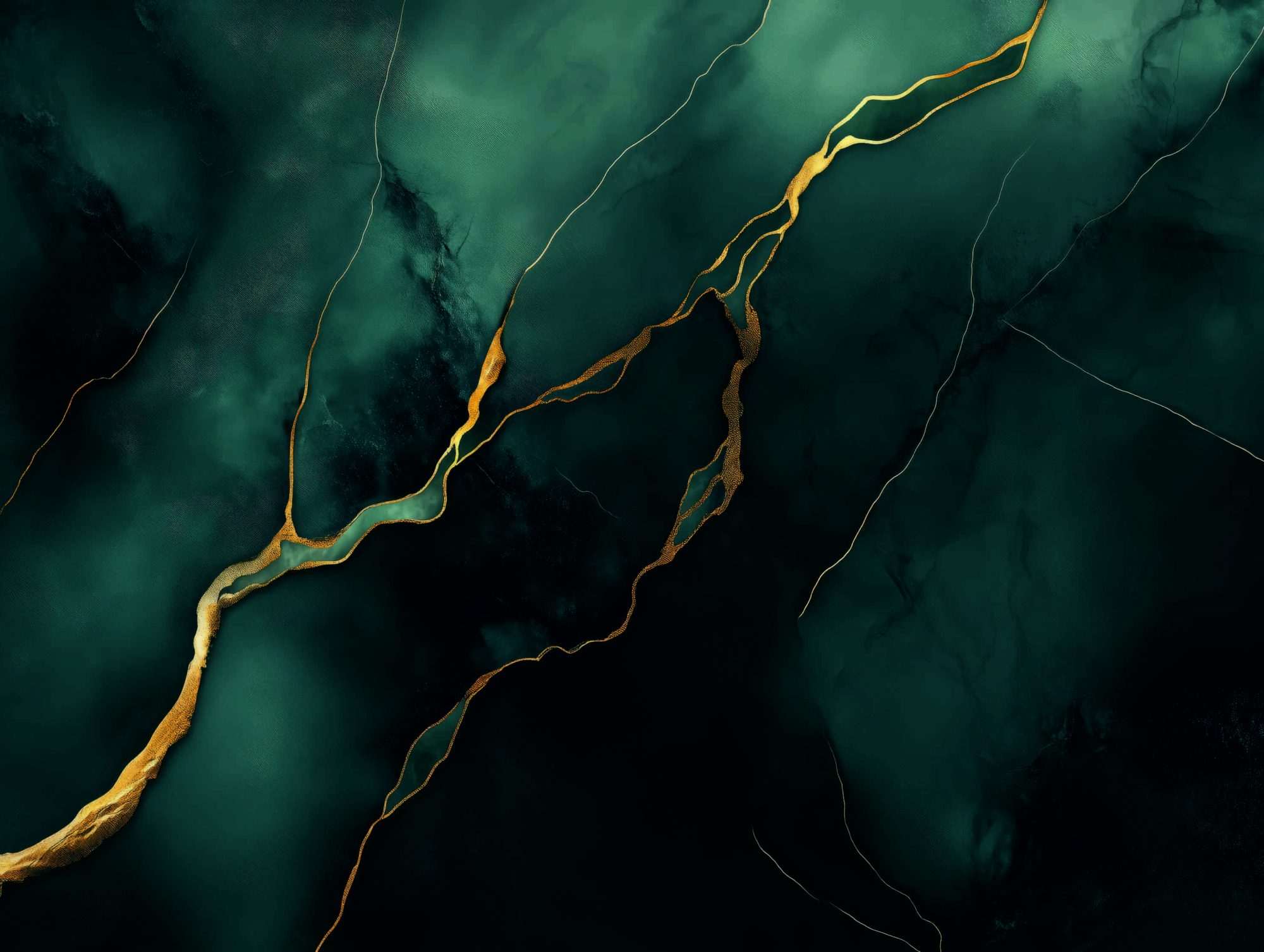 Dit fotobehang donker marmer met gouden aders toont een diep gekleurde marmerstructuur waarin dunne goudkleurige lijnen door het oppervlak lijken te lopen. De compositie bestaat uit donkere tinten groen en bijna zwarte schaduwpartijen die samen een mysterieuze en gelaagde achtergrond vormen. De goudachtige aders snijden diagonale routes door het marmer en zorgen voor een duidelijk visueel contrast.