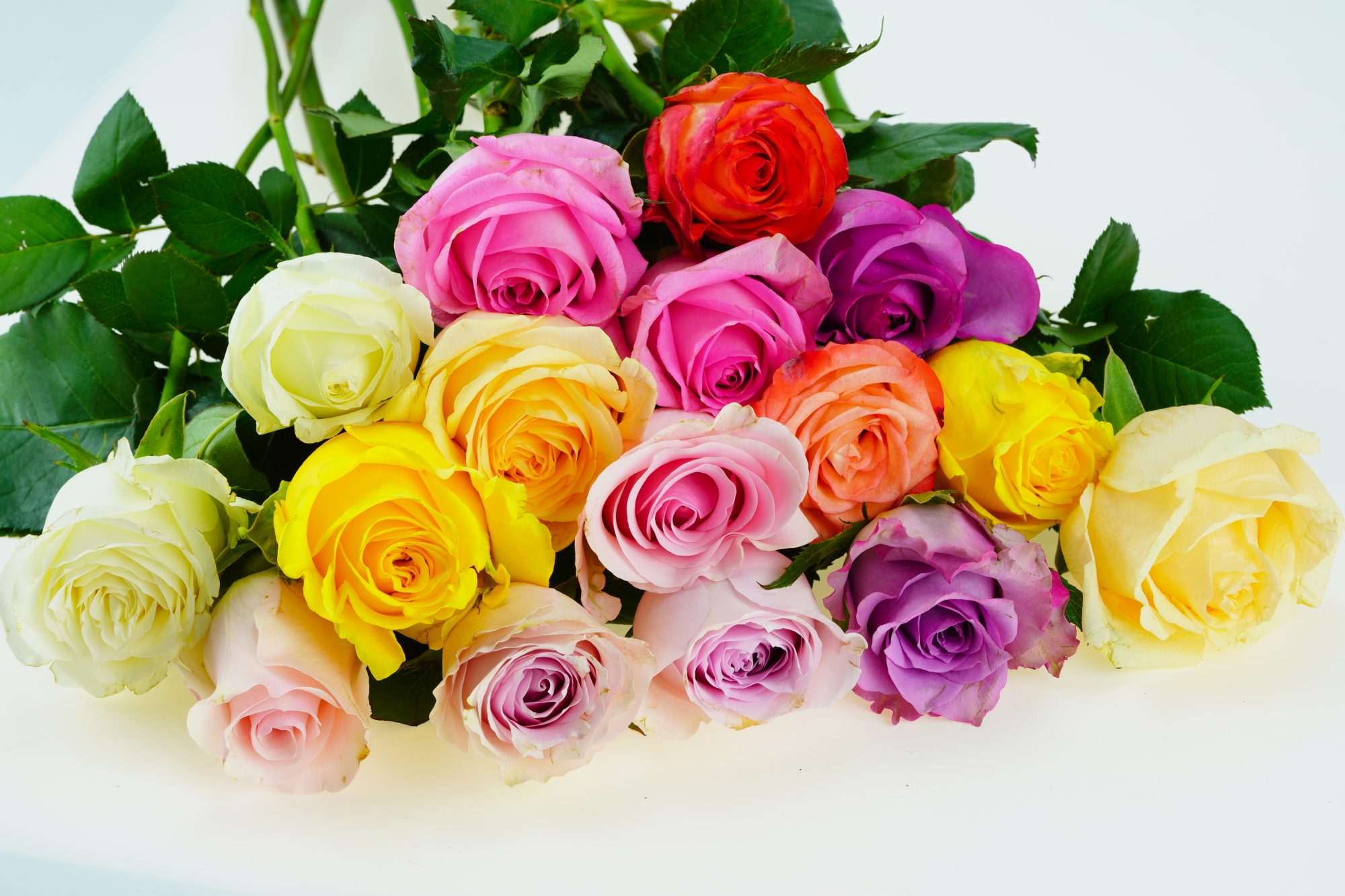 Het licht valt gelijkmatig over het boeket. Hierdoor blijven alle rozen duidelijk zichtbaar. Tussen de bloemen ontstaan kleine schaduwen die de verschillende lagen benadrukken.