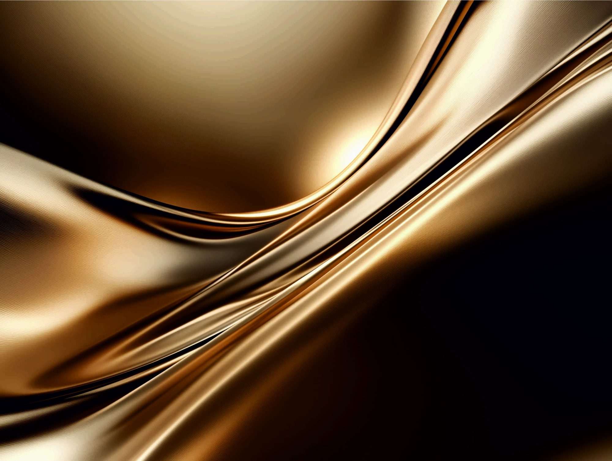 Dit fotobehang gouden abstracte golfstructuur toont een vloeiende compositie waarin golvende lijnen over het beeld bewegen. De vormen lijken opgebouwd uit vloeibare metalen lagen die zacht in elkaar overlopen. Hierdoor ontstaat een dynamische maar elegante structuur.