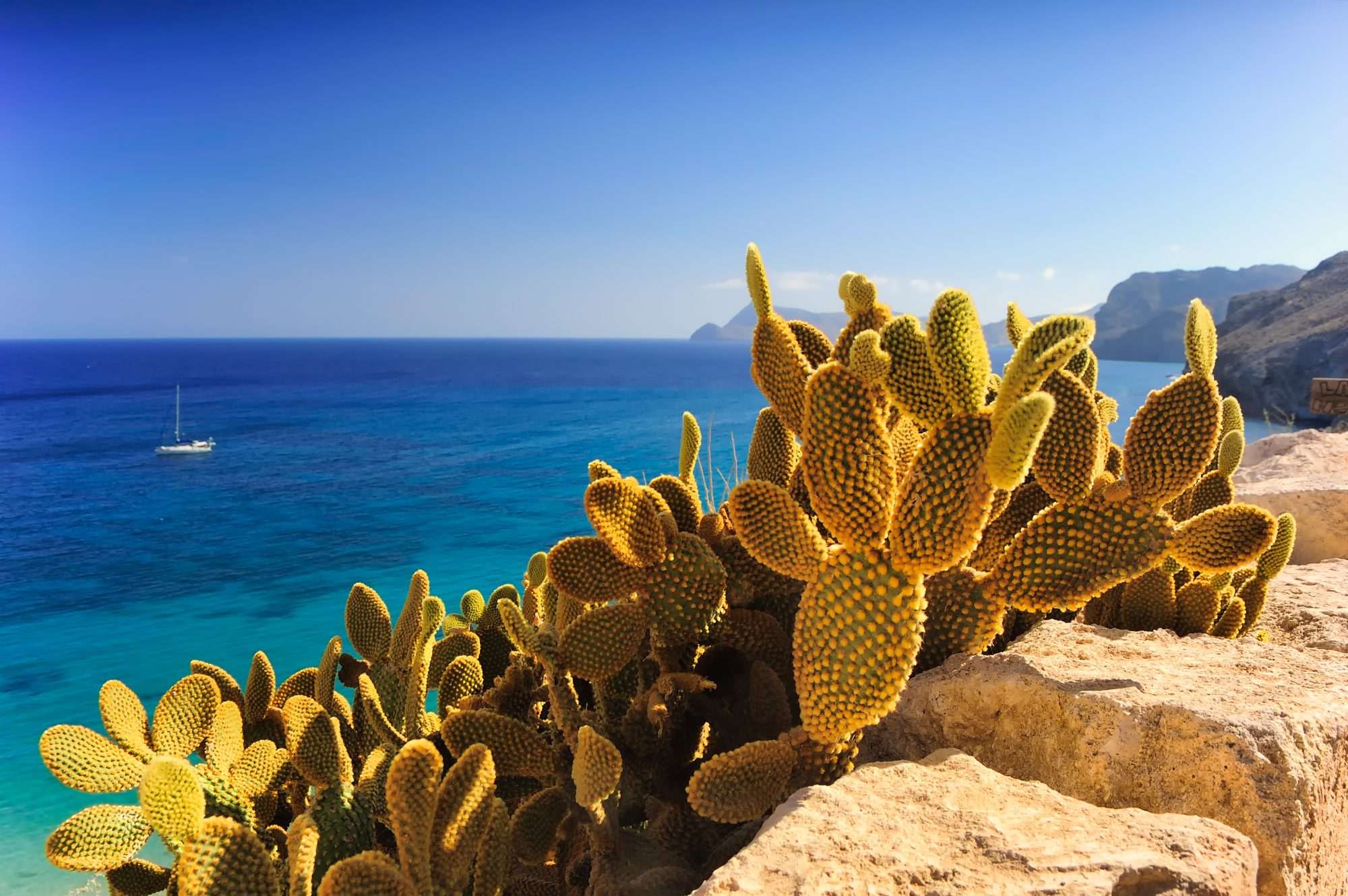 Dit fotobehang toont een cactus op een rotsachtige kustlijn van Ibiza met uitzicht op een helderblauwe zee. De compositie is opgebouwd met een sterke voorgrond waarin de cactus centraal staat. De zee strekt zich horizontaal uit richting de horizon, terwijl op de achtergrond zachte bergvormen zichtbaar zijn.