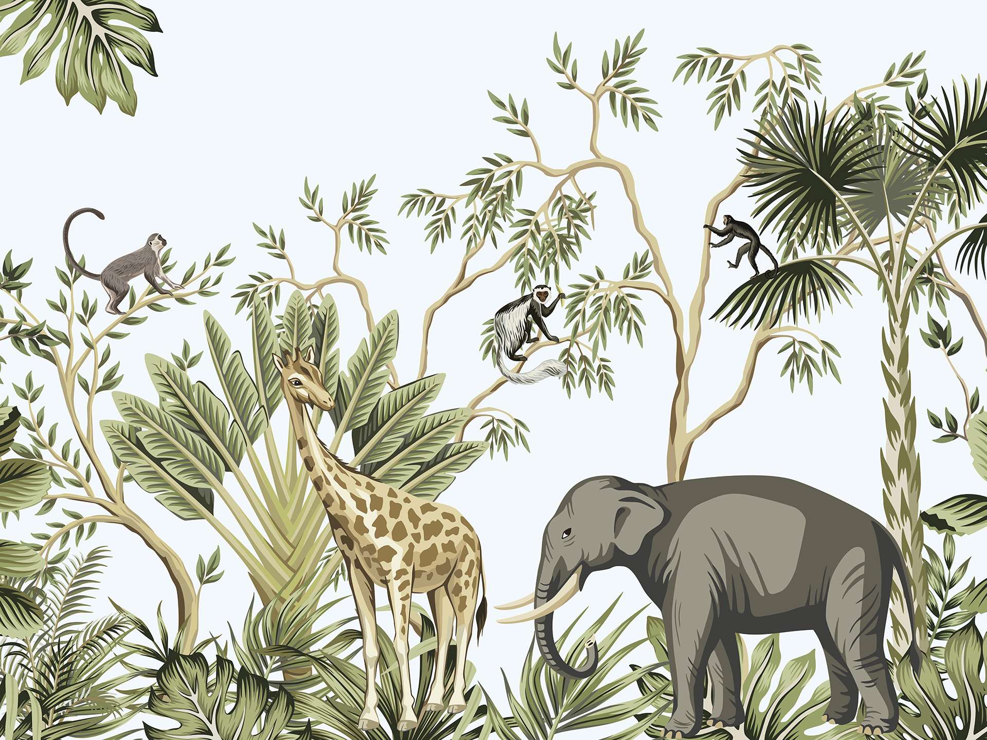 Dit fotobehang jungle dieren illustratie kinderkamer toont een levendige scène waarin verschillende jungle dieren tussen tropische planten bewegen. De compositie bestaat uit een rijk gevulde achtergrond met bladeren, takken en exotische planten. Tussen het groen zijn dieren zoals een giraffe en olifant zichtbaar.
