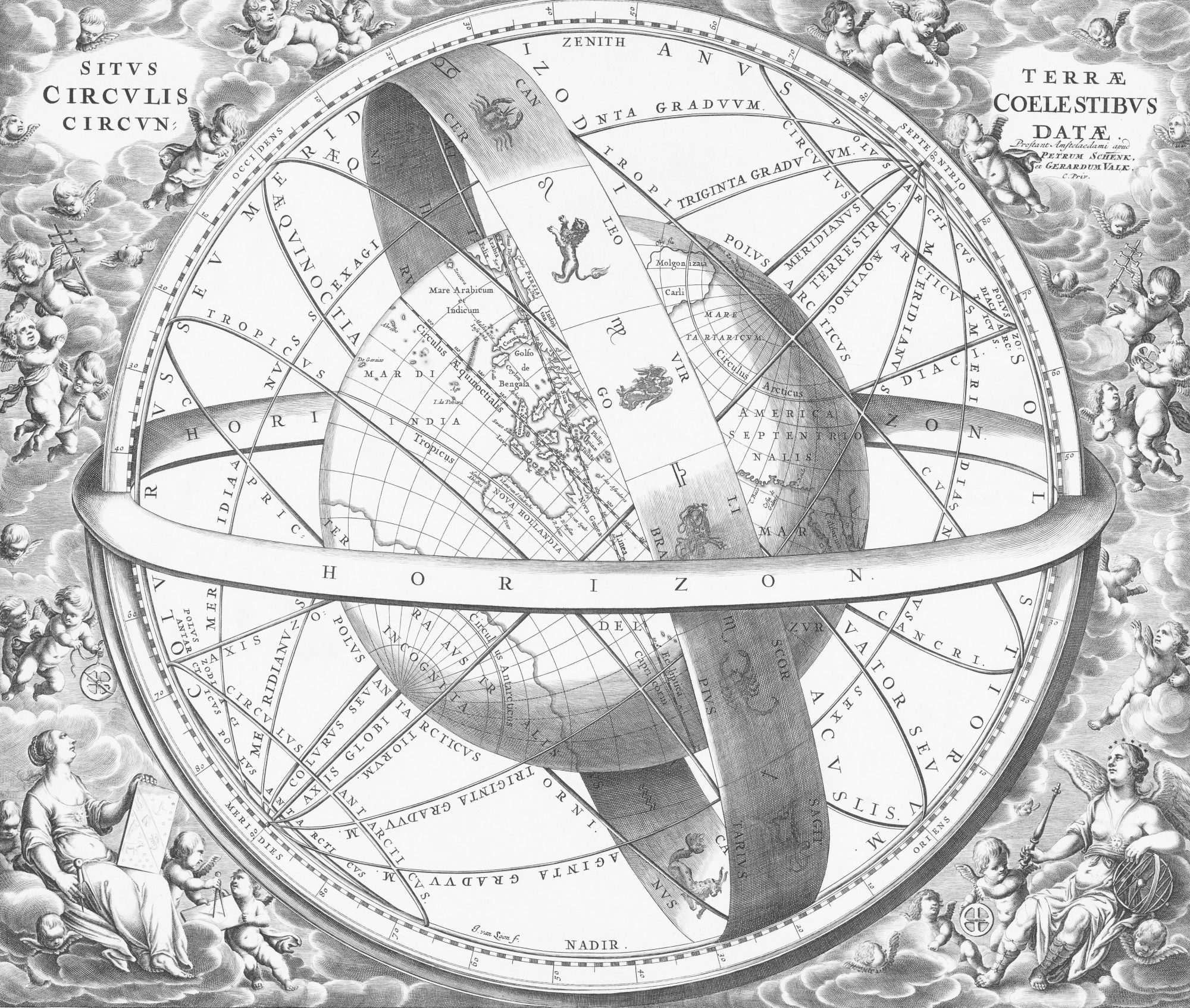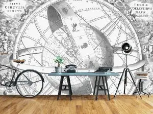 Fotobehang klassieke wereldkaart gravure toont een gedetailleerde kaartcompositie waarin geografische elementen en decoratieve lijnen samenkomen. De kaart is centraal geplaatst en omgeven door cirkelvormige structuren en meetinstrumentachtige details, wat het beeld een technische en historische uitstraling geeft.