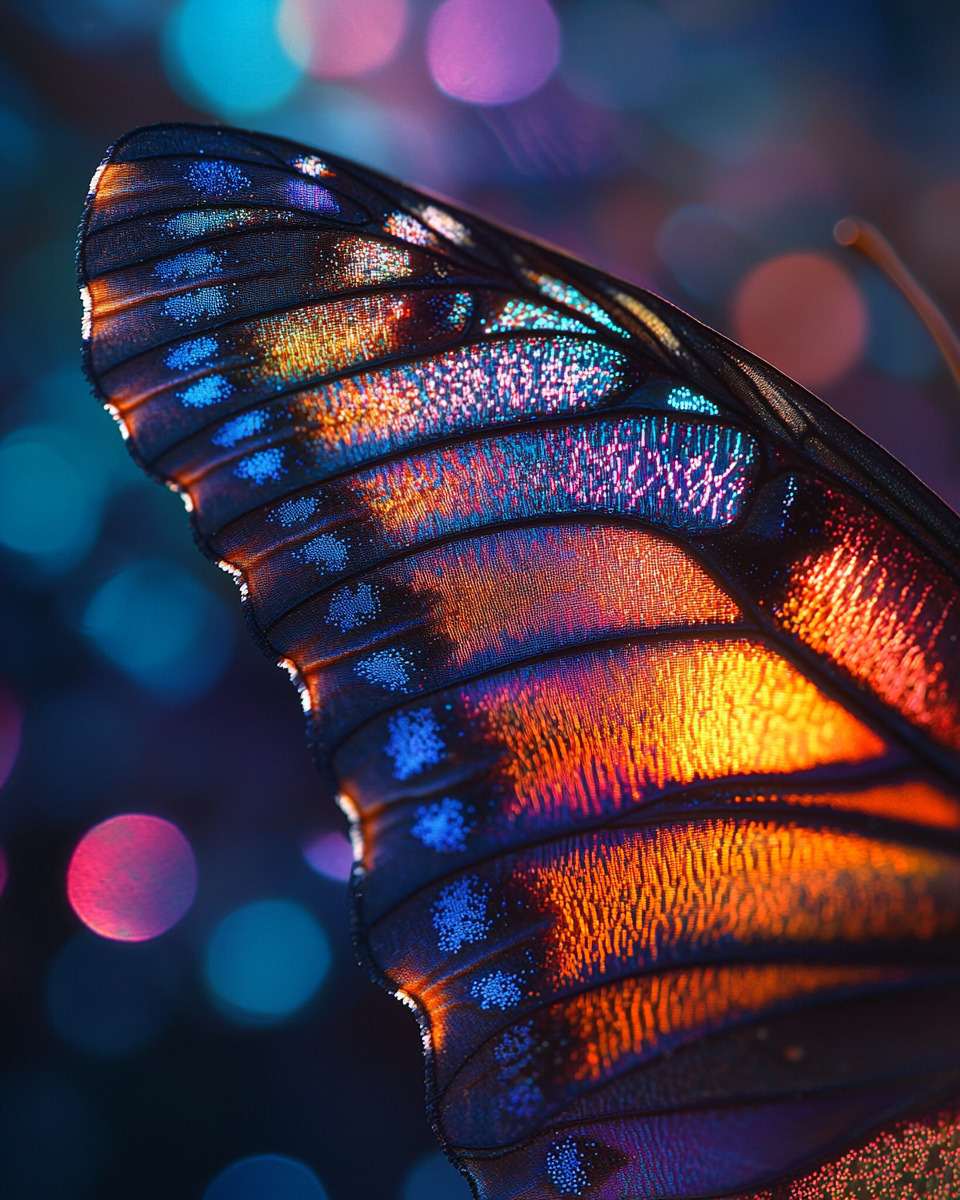 Dit fotobehang toont een macro van een vlindervleugel. De felle kleuren en patronen zorgen voor een dynamisch effect.