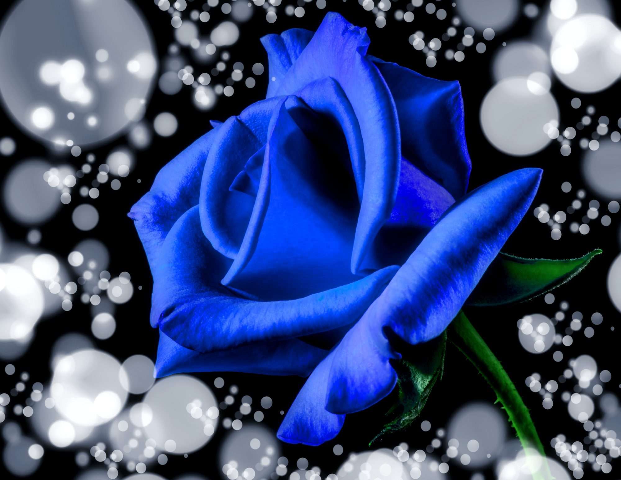 Dit fotobehang kobaltblauwe roos toont een intens blauwe roos die centraal in beeld staat tegen een achtergrond van zachte lichtpunten. De bloem wordt omringd door ronde bokehreflecties die het beeld een glanzend en dynamisch karakter geven. Hierdoor ontstaat een contrast tussen de scherpe bloemstructuur en de zachte achtergrond.