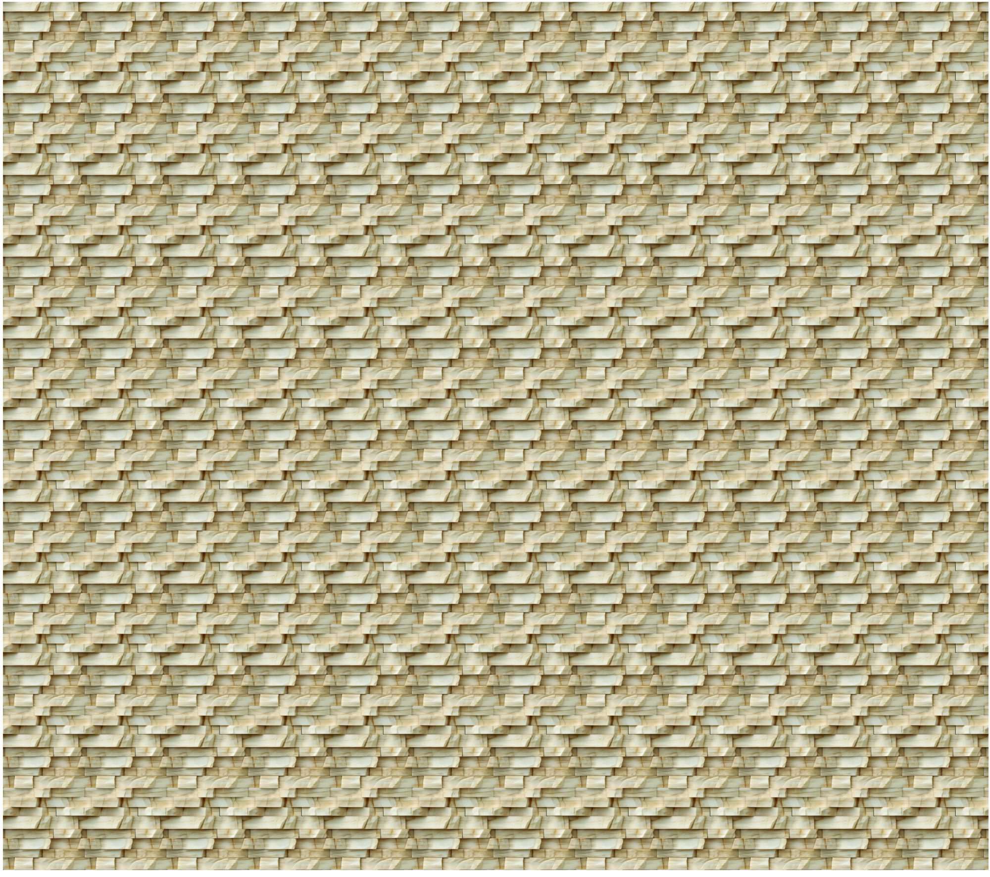 Het licht valt langs de randen van de stenen en benadrukt het reliëf van het patroon. Kleine schaduwen tussen de lagen versterken de dieptewerking en zorgen voor een overtuigend driedimensionaal effect.