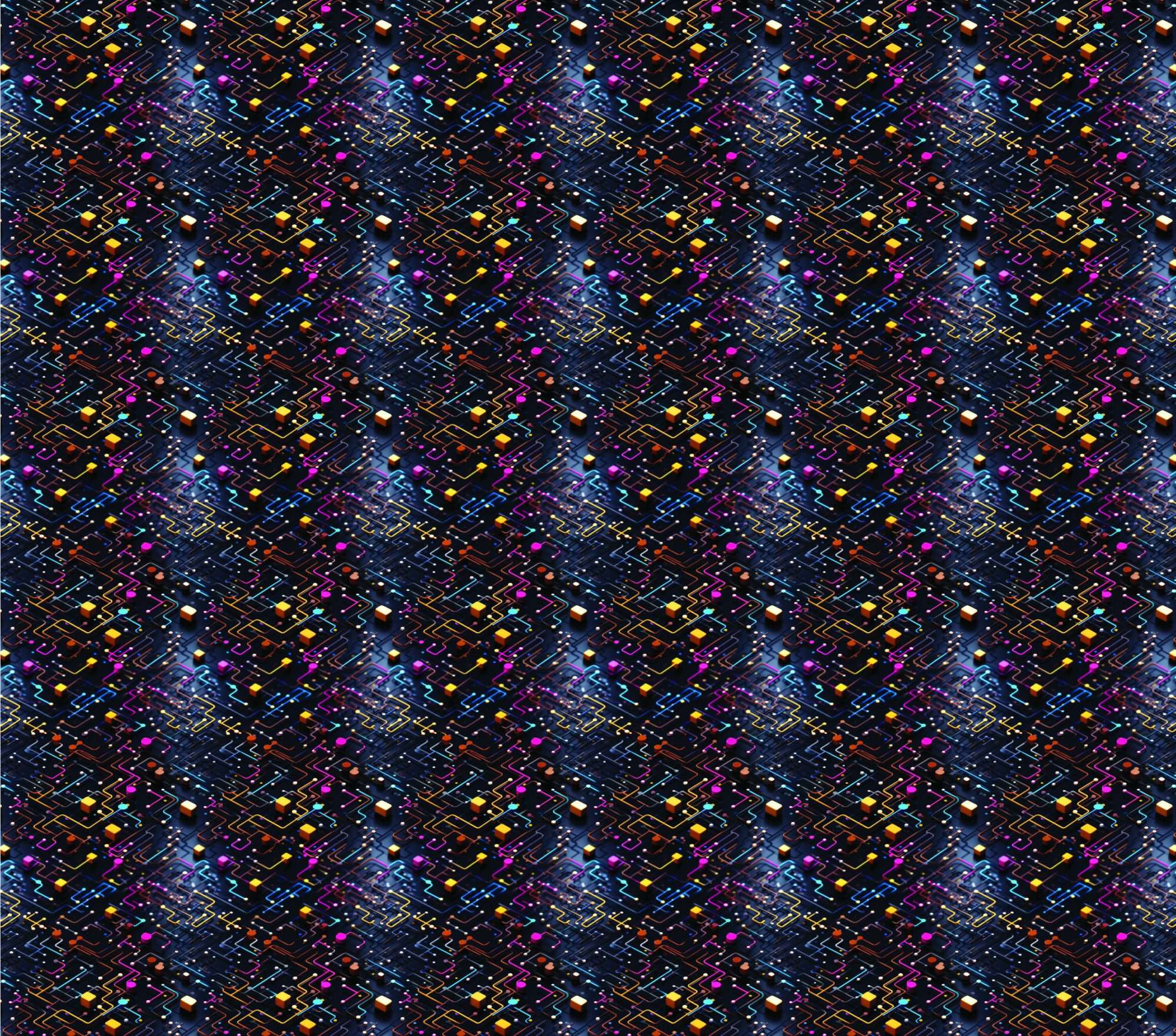 Dit fotobehang neon abstract kleurenpatroon toont een grafisch ontwerp van lichtlijnen en kleurrijke patronen tegen een donkere achtergrond. De compositie bestaat uit lijnen en symbolen die door het beeld bewegen.