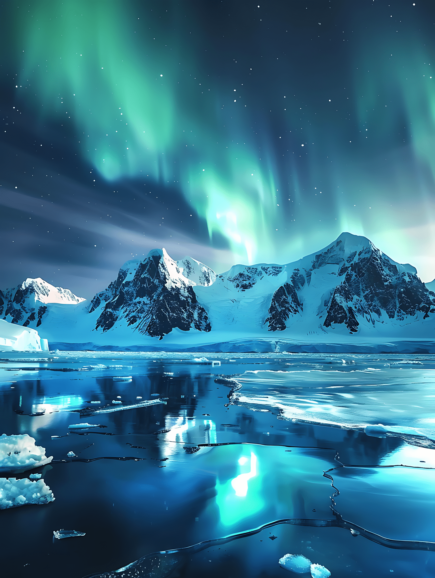 Het fotobehang noorderlicht besneeuwde bergketen zorgt voor diepte en rust in iedere ruimte.