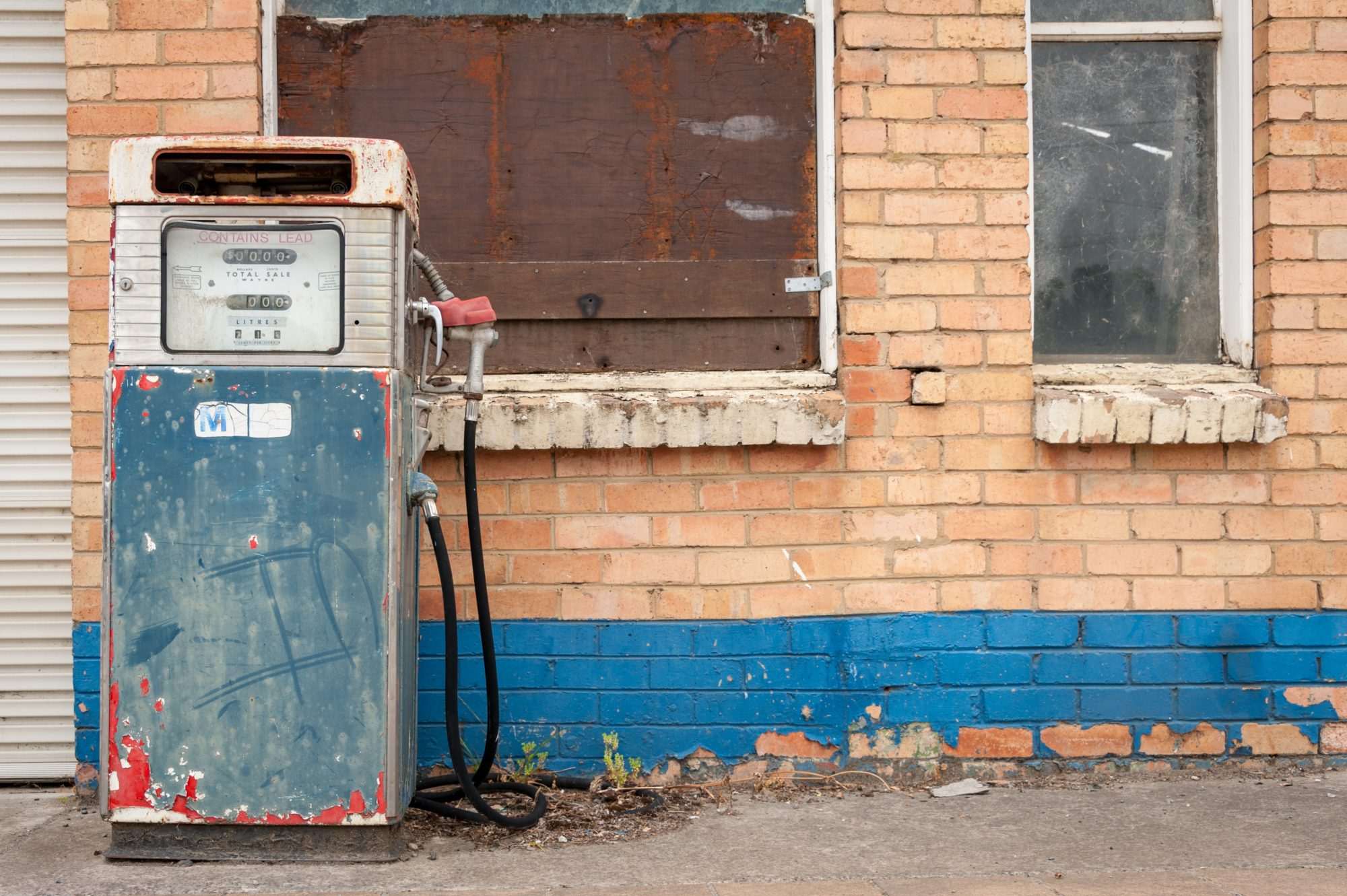 Een retro benzinepomp tegen een verweerde gevel. Het beeld straalt nostalgie en industrieel karakter uit.