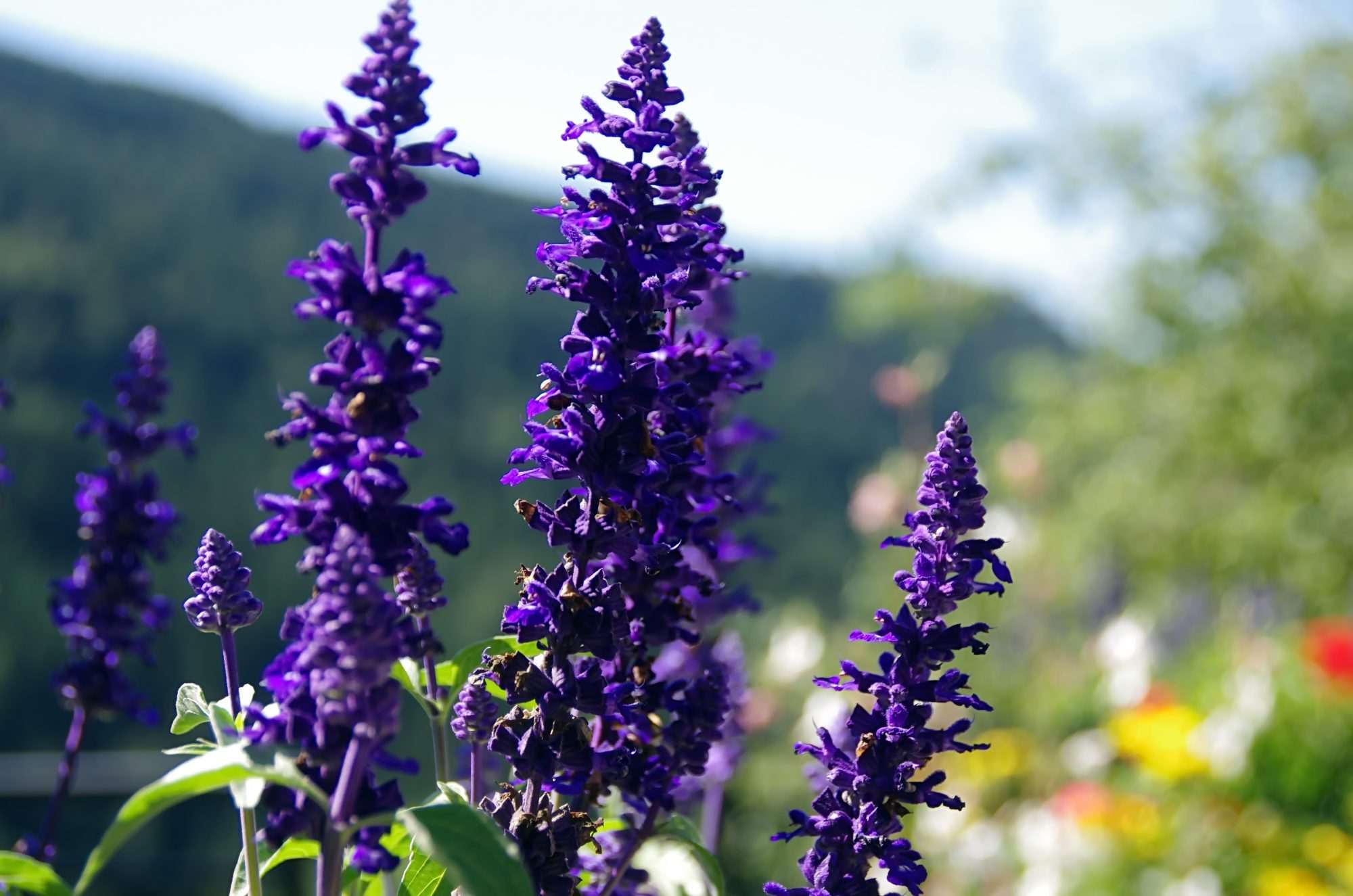 De saliebloemen groeien in lange aren langs de stengel. De kleine paarse bloemblaadjes vormen een reeks bloemen die naar boven toe smaller worden.