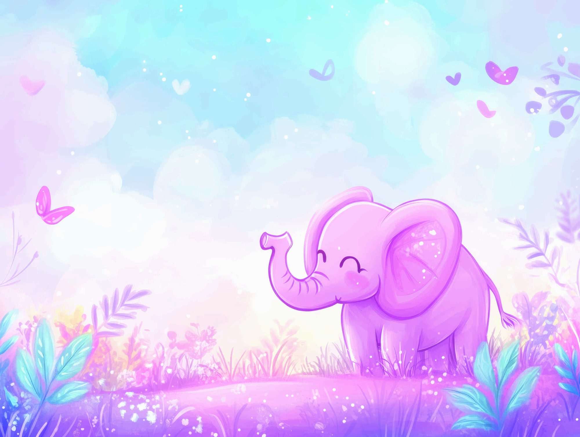 Dit fotobehang pastel olifant bloemen kinderkamer toont een zachte illustratie van een kleine olifant die tussen bloemen en planten staat. De compositie bestaat uit een open veld waarin bloemen, gras en lichte planten het landschap vormen. In het midden van het beeld staat een roze olifant die rustig door het veld loopt.