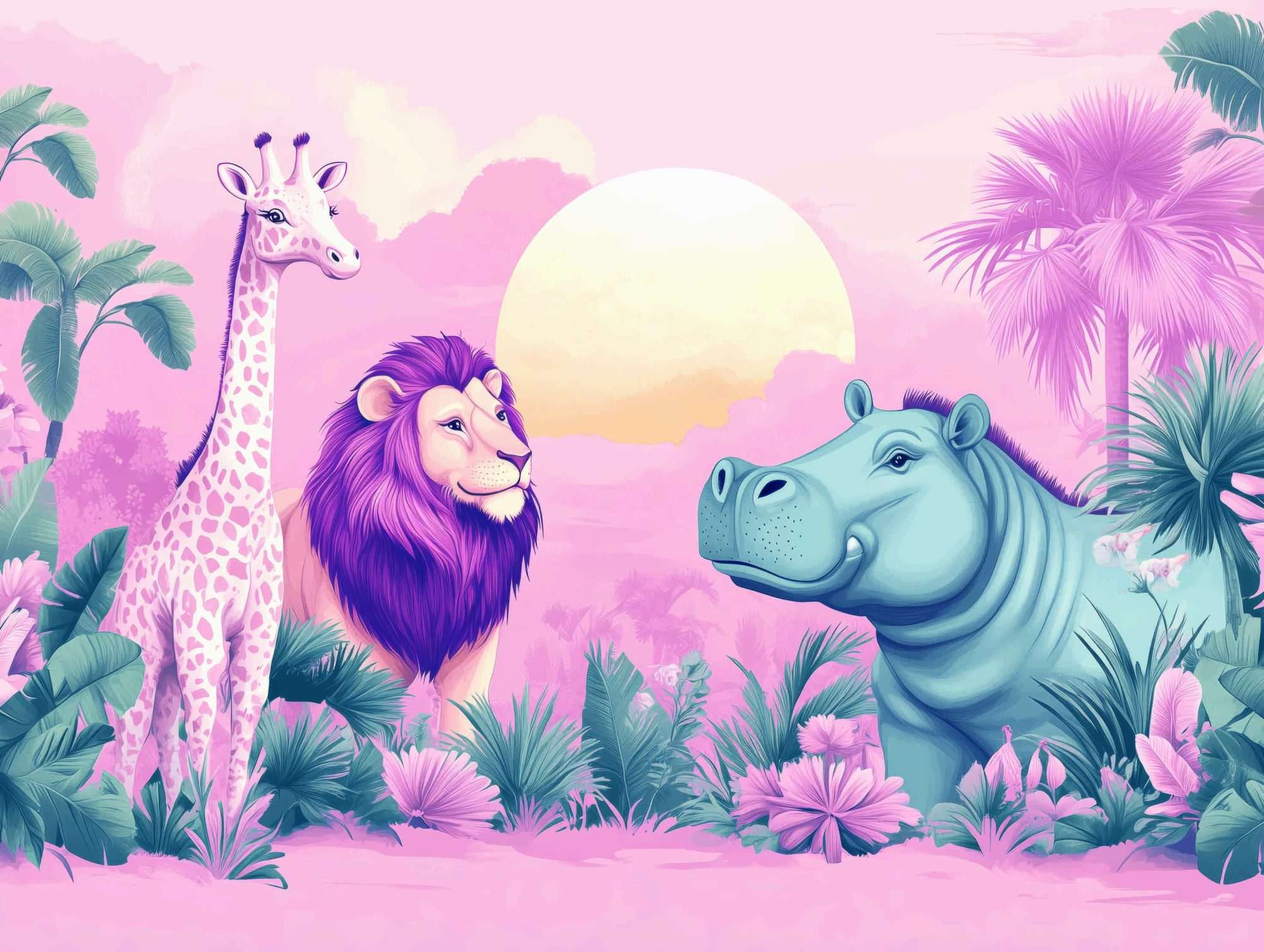 Dit fotobehang pastel safari dieren kinderkamer toont een zachte illustratie van verschillende safaridieren in een rustig tropisch landschap. De compositie bestaat uit een open omgeving met palmbomen, planten en een warme zonsondergang op de achtergrond. In het midden van het beeld staan een giraffe, leeuw en nijlpaard samen in een ontspannen scène.
