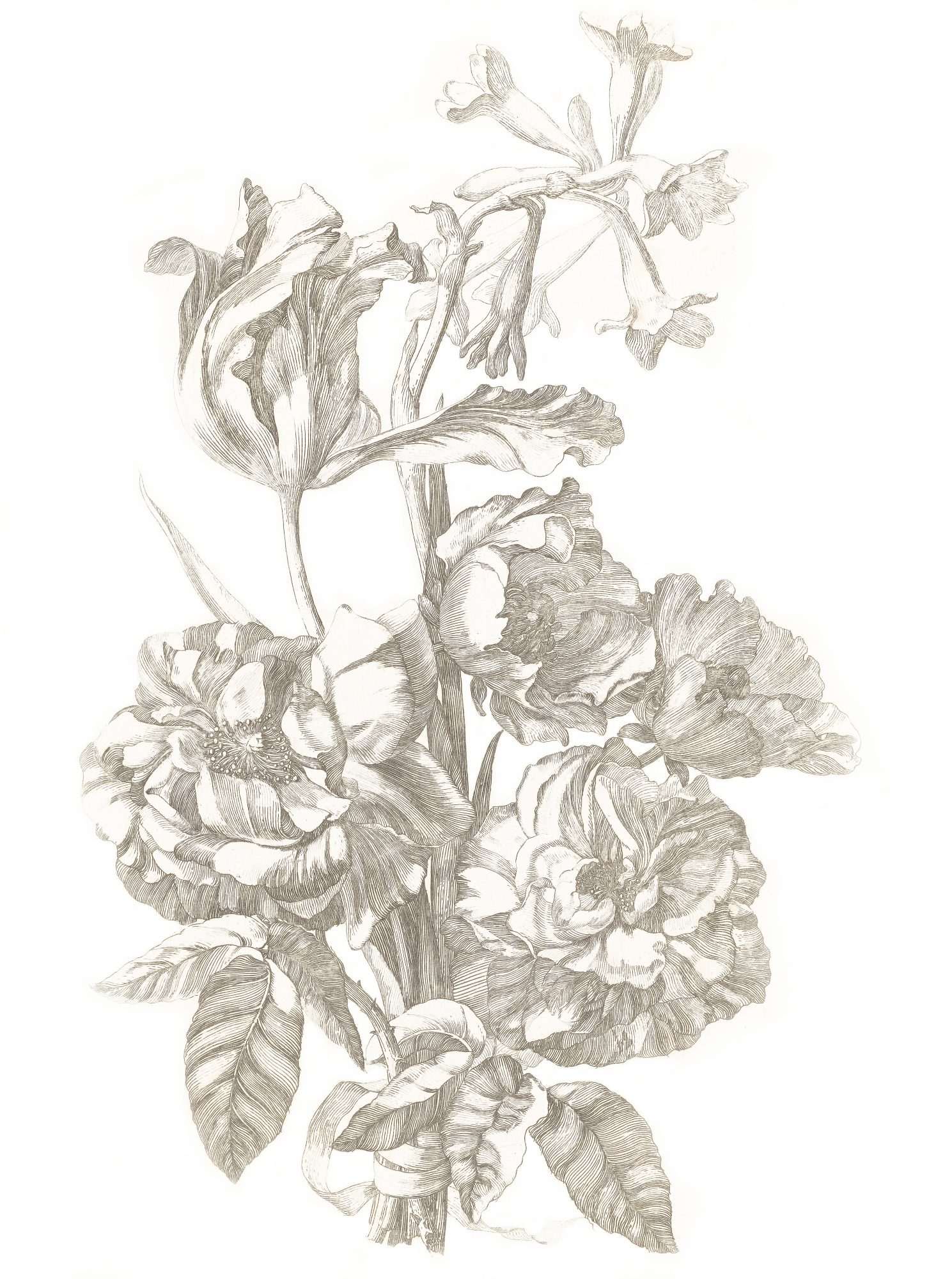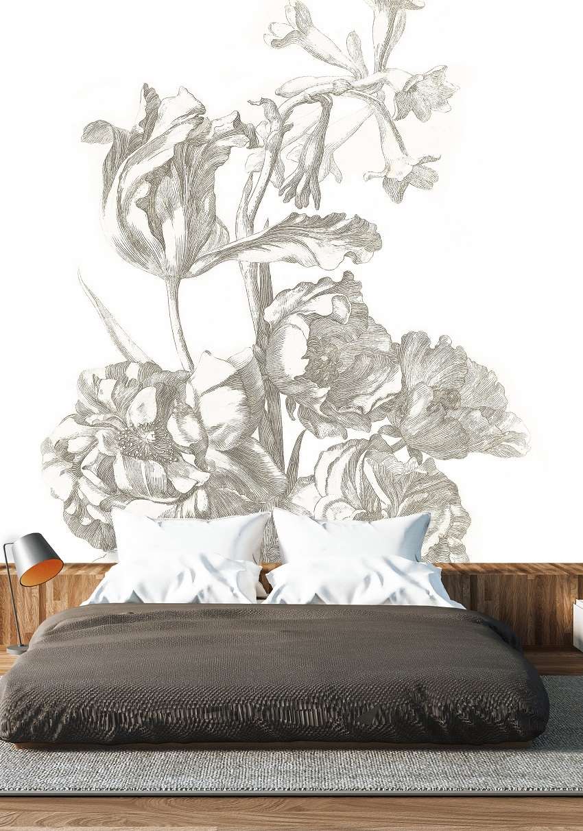 Fotobehang pentekening bloemen botanisch laat een verfijnde verzameling bloemvormen zien waarin lijn en structuur centraal staan. De compositie is verticaal georiënteerd en opgebouwd uit verschillende bloemen die elkaar deels overlappen. Hierdoor ontstaat een natuurlijk ogend geheel met een duidelijke balans.