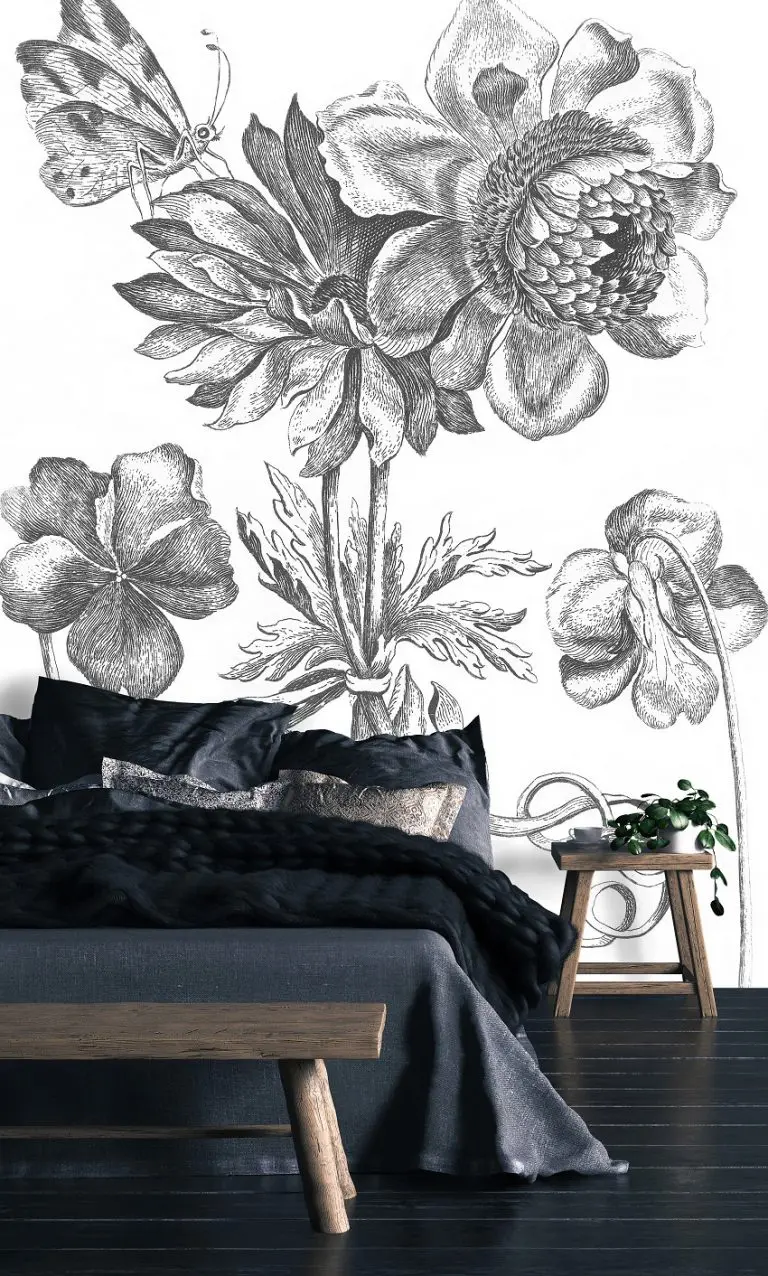 Fotobehang pentekening bloemen met vlinder combineert botanische elementen met een subtiel dierlijk detail. De compositie is compact opgebouwd, waarbij bloemen en bladeren zich rondom de vlinder groeperen. Dit zorgt voor een duidelijk middelpunt zonder dat het geheel statisch wordt.