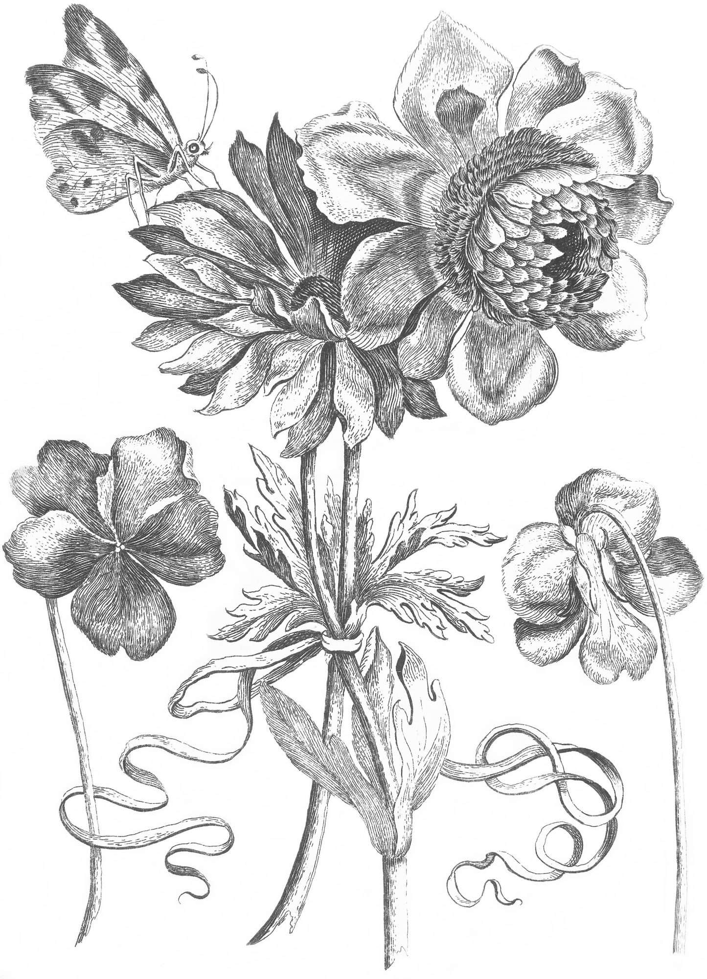De dieptewerking ontstaat door overlapping en variatie in lijnintensiteit. De bloemen op de voorgrond zijn duidelijker aanwezig, terwijl andere delen meer naar de achtergrond verdwijnen. De vlinder lijkt licht boven het geheel te zweven, wat extra ruimtelijkheid toevoegt.