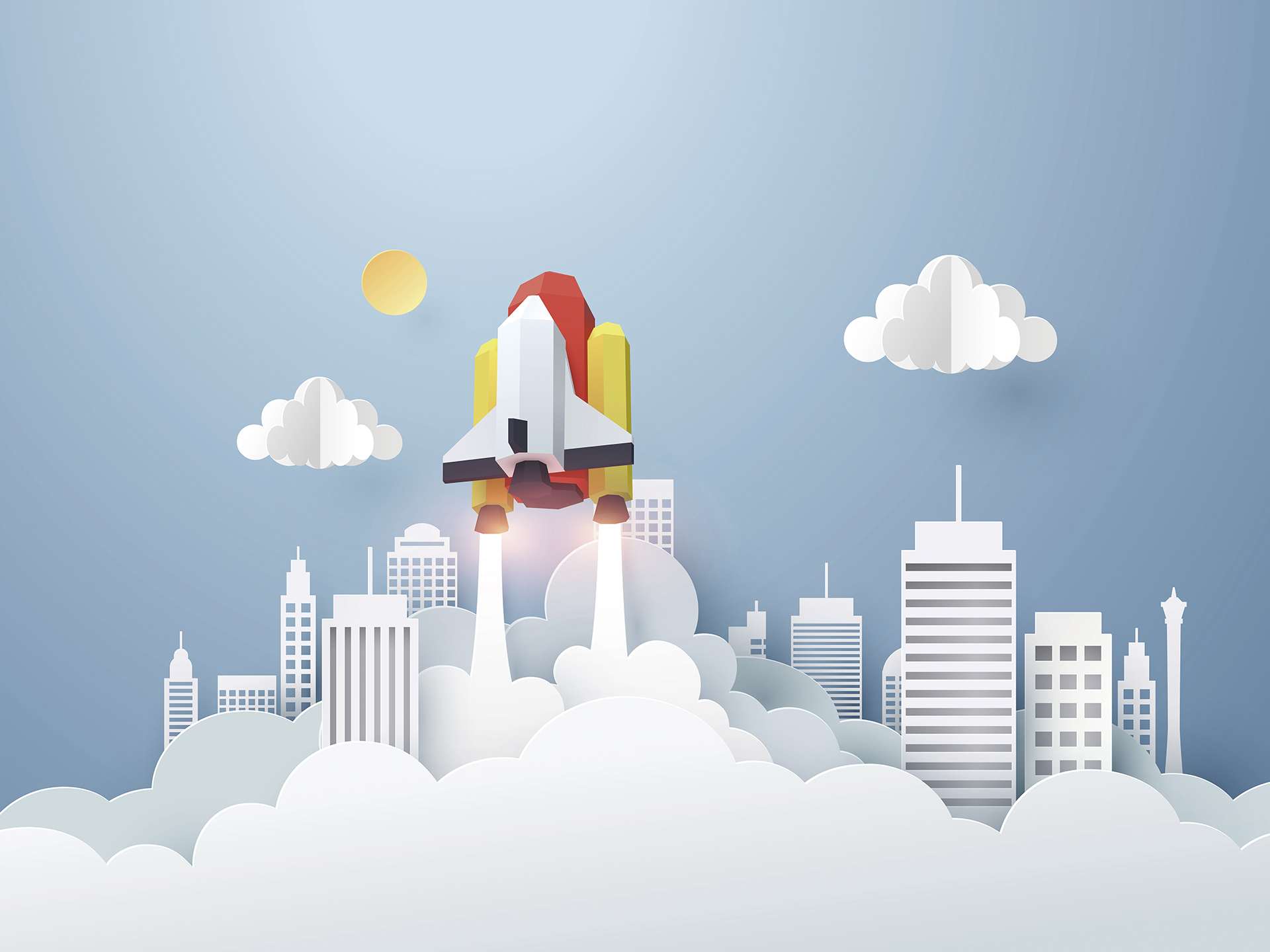 Dit fotobehang raket en wolken stad kinderkamer toont een fantasierijke scène waarin een raket opstijgt boven een stad die uit wolken lijkt te bestaan. De compositie bestaat uit een skyline van eenvoudige gebouwen die op zachte wolken staan. Boven de stad stijgt een kleurrijke raket omhoog richting de lucht.