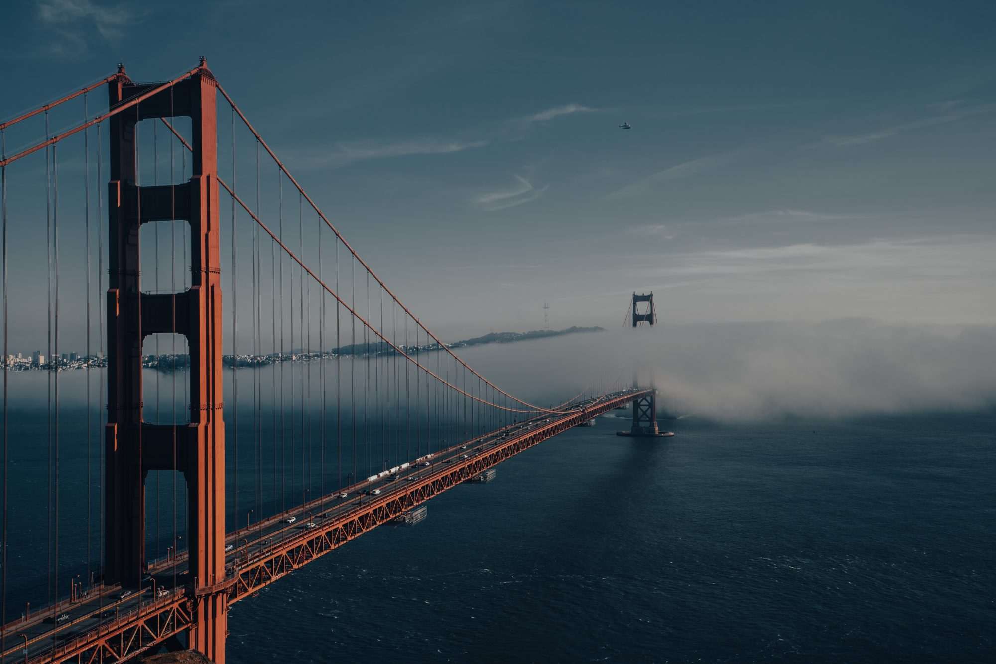 Dit fotobehang toont een rode hangbrug boven zee in mist. De mistige achtergrond geeft een dramatische sfeer.