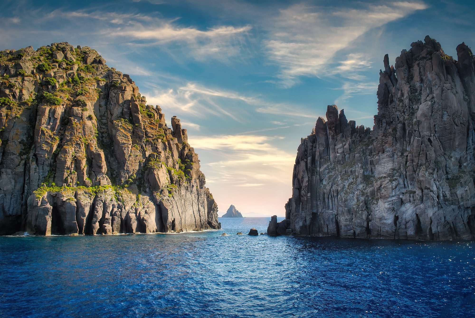 Dit fotobehang toont indrukwekkende rotsformaties die oprijzen uit een diepe blauwe zee. De compositie is opgebouwd rond twee grote rotsmassieven die centraal in het beeld staan. De open ruimte tussen de rotsen creëert een natuurlijke doorgang waar het water zichtbaar wordt. Deze opening trekt het oog automatisch naar het midden van het beeld.