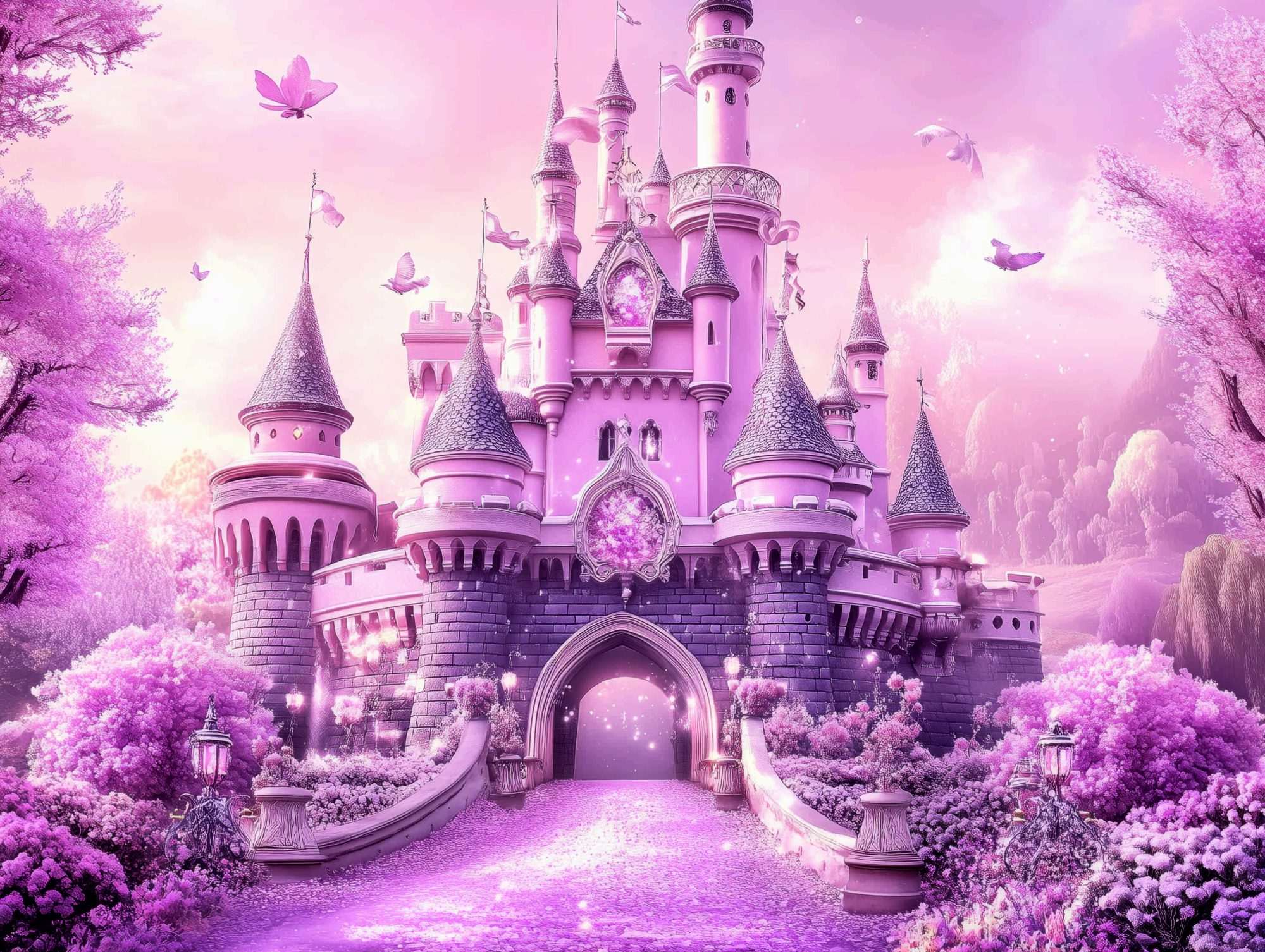 Dit fotobehang roze sprookjeskasteel klassiek kinderkamer toont een gedetailleerd kasteel dat centraal staat in een zachte en symmetrische compositie. De ingang van het kasteel wordt bereikt via een brug die het beeld een duidelijke structuur geeft.