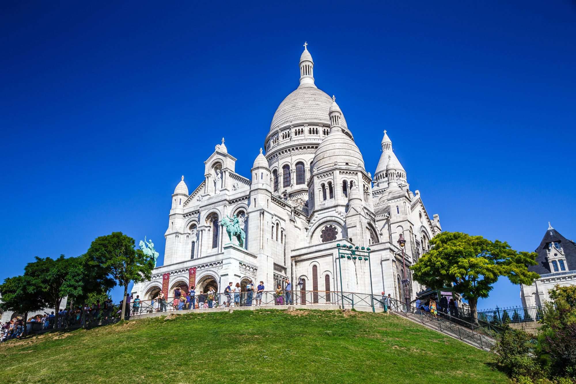 De architectuur van de Sacré-Cœur is gedetailleerd zichtbaar. De ronde koepels, torens en bogen zorgen voor ritme in de vormgeving. De witte gevel vangt het daglicht en creëert zachte schaduwen.