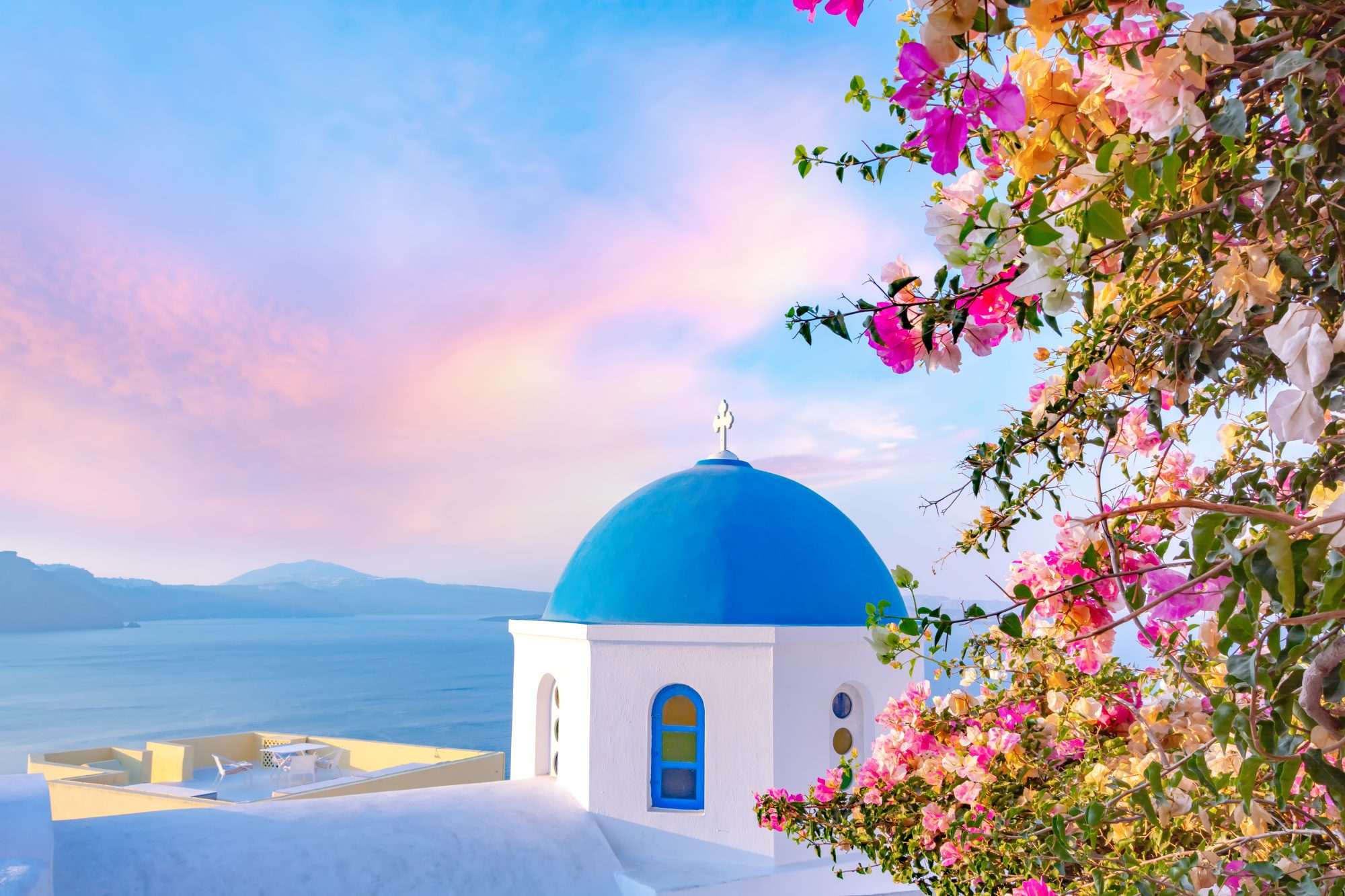 Dit fotobehang toont een iconische blauwe koepel op Santorini tijdens zonsopkomst, omlijst door kleurrijke bloemen. De compositie is verticaal gecentreerd met de koepel als dominant middelpunt en de zee op de achtergrond.