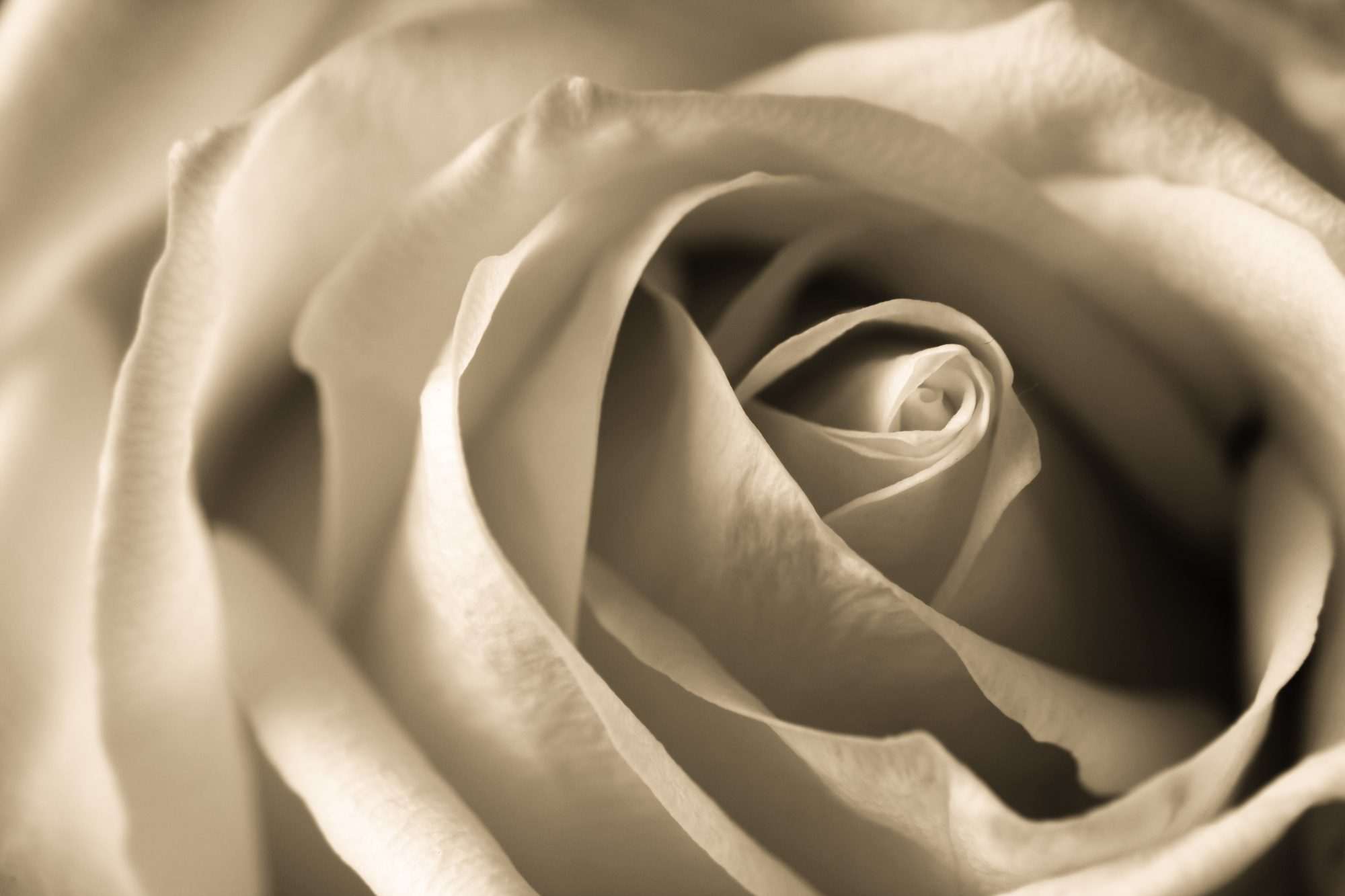 Dit fotobehang sepia roos macro toont een gedetailleerde close-up van een roos in een warme sepia tint. De compositie richt zich volledig op de spiraalvorm van de bloemblaadjes.