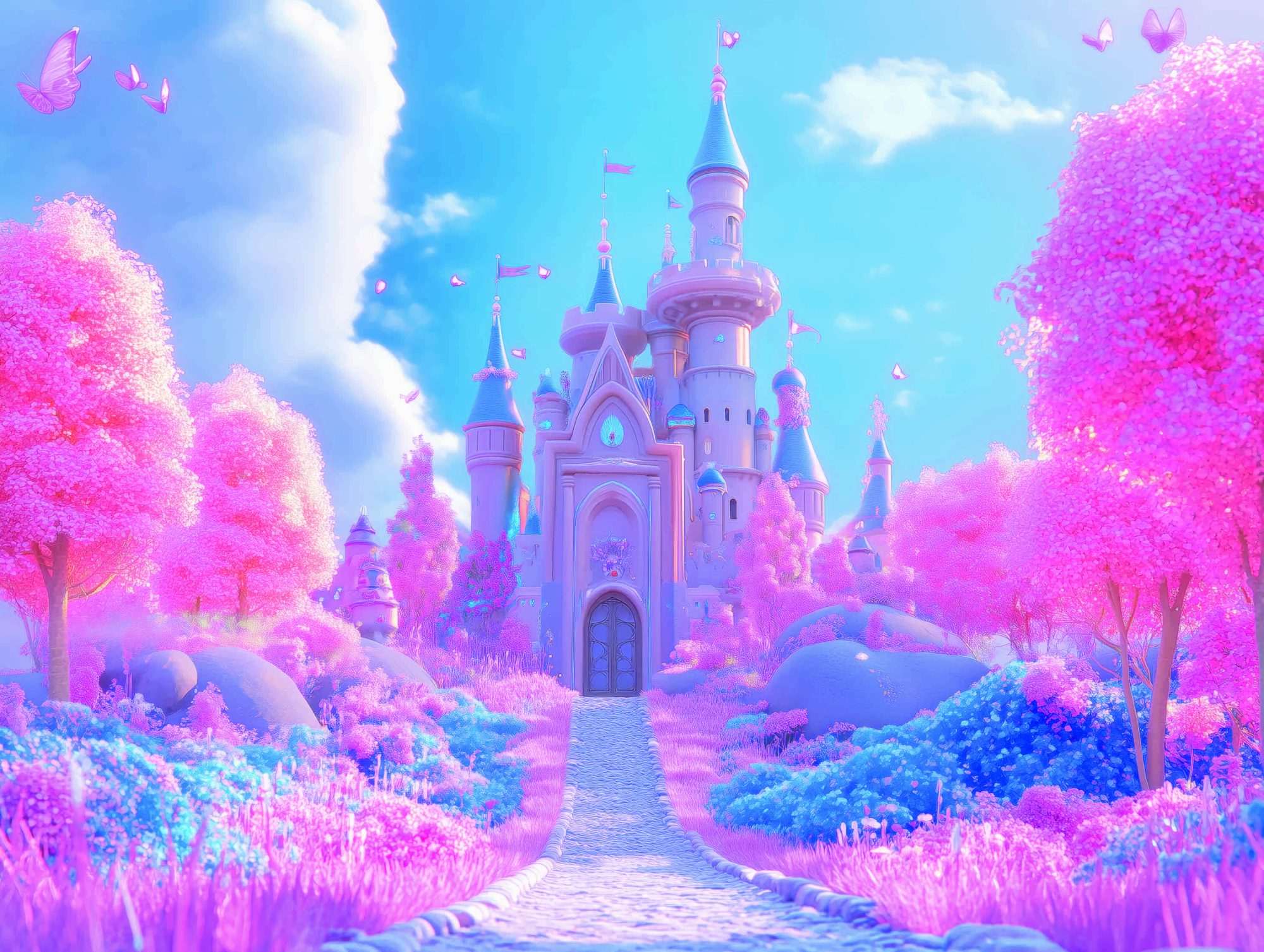 Dit fotobehang sprookjeskasteel pastel roze kinderkamer toont een dromerige scène waarin een groot kasteel centraal staat in een zacht gekleurd landschap. De compositie bestaat uit een pad dat leidt naar het kasteel, omringd door bloeiende bomen en een open lucht. Het kasteel vormt het middelpunt van het beeld en trekt direct de aandacht.