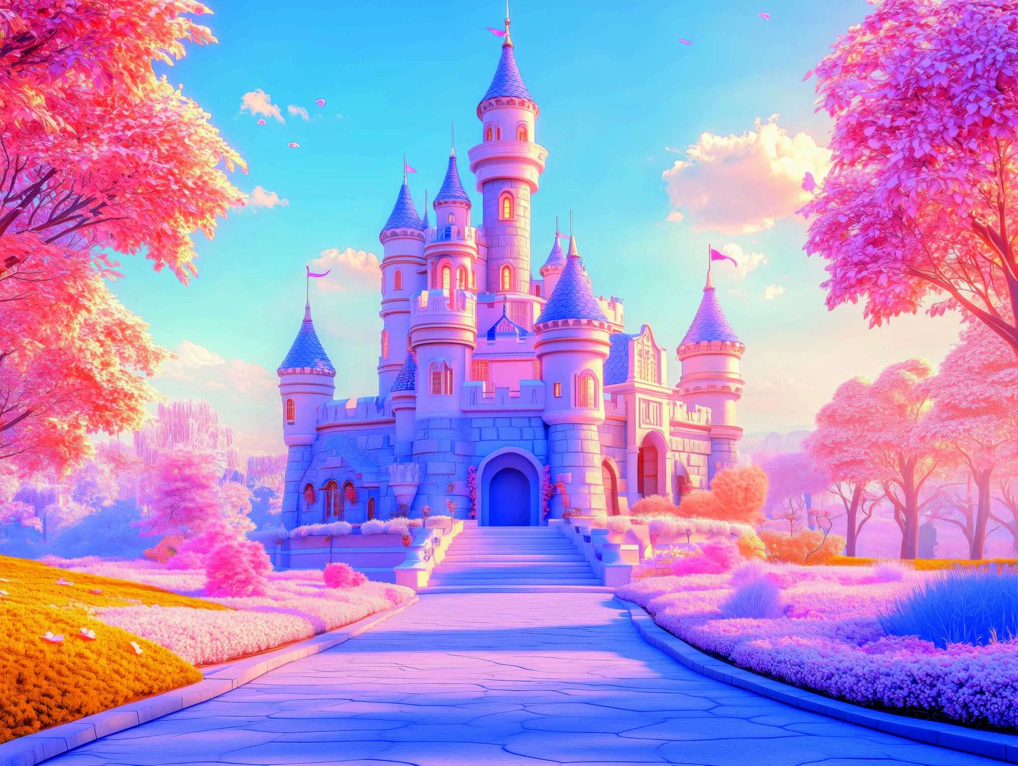 Door de combinatie van warm licht, een pad en een sprookjeskasteel ontstaat een wandbeeld dat sfeer en fantasie samenbrengt.