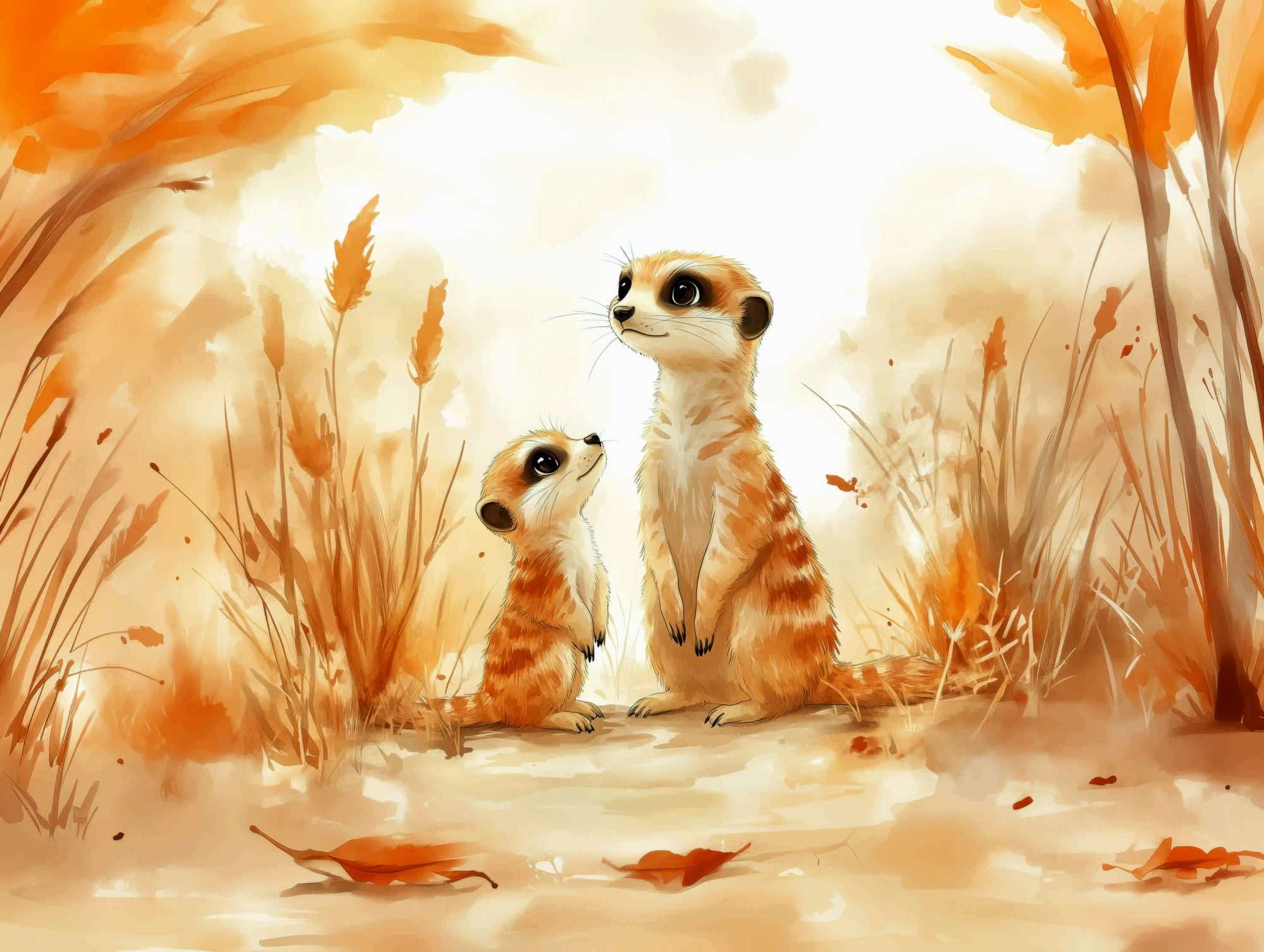 Dit fotobehang stokstaartjes in warm natuur landschap kinderkamer toont een rustige illustratie van twee stokstaartjes die samen in een zonnig veld staan. De compositie bestaat uit een open landschap met zachte grassprieten, lichte bloemen en warme zandtinten. De twee dieren staan centraal in het beeld en kijken nieuwsgierig omhoog, wat het ontwerp een speelse en vriendelijke uitstraling geeft.