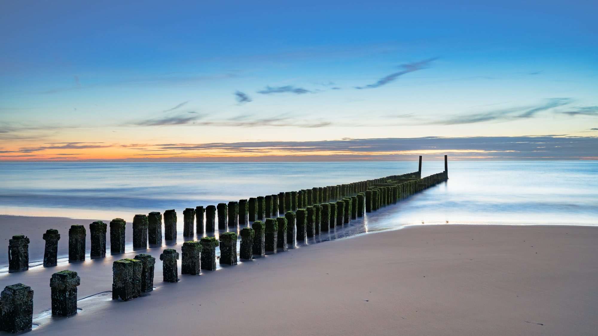 Dit fotobehang toont een rustig strand met een rij houten palen die richting zee loopt tijdens zonsopkomst. De compositie is sterk lineair opgebouwd. De palen vormen een duidelijke lijn die het oog naar de horizon leidt.
