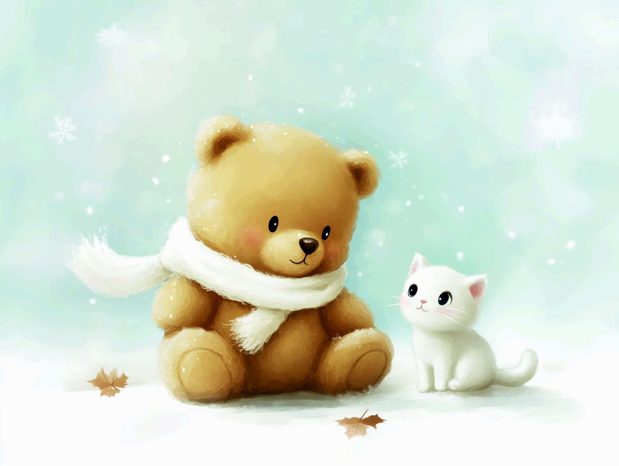 Dit fotobehang teddybeer en kitten winter kinderkamer toont een zachte winterscène waarin een teddybeer samen met een klein katje in een besneeuwd landschap zit. De compositie bestaat uit een open vlak met sneeuw in de voorgrond en een lichte, vervaagde achtergrond. De twee dieren zitten centraal en vormen het belangrijkste focuspunt van het beeld.