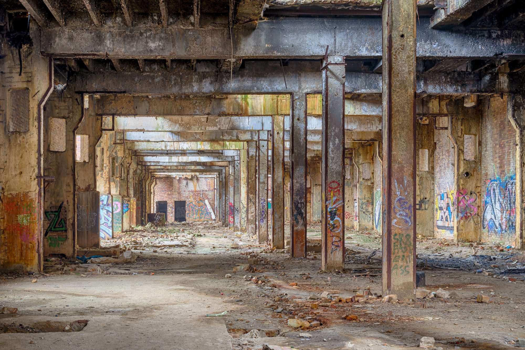 Een grote fabriekshal met betonnen pijlers en open structuur. De herhaling van lijnen zorgt voor een krachtig effect.