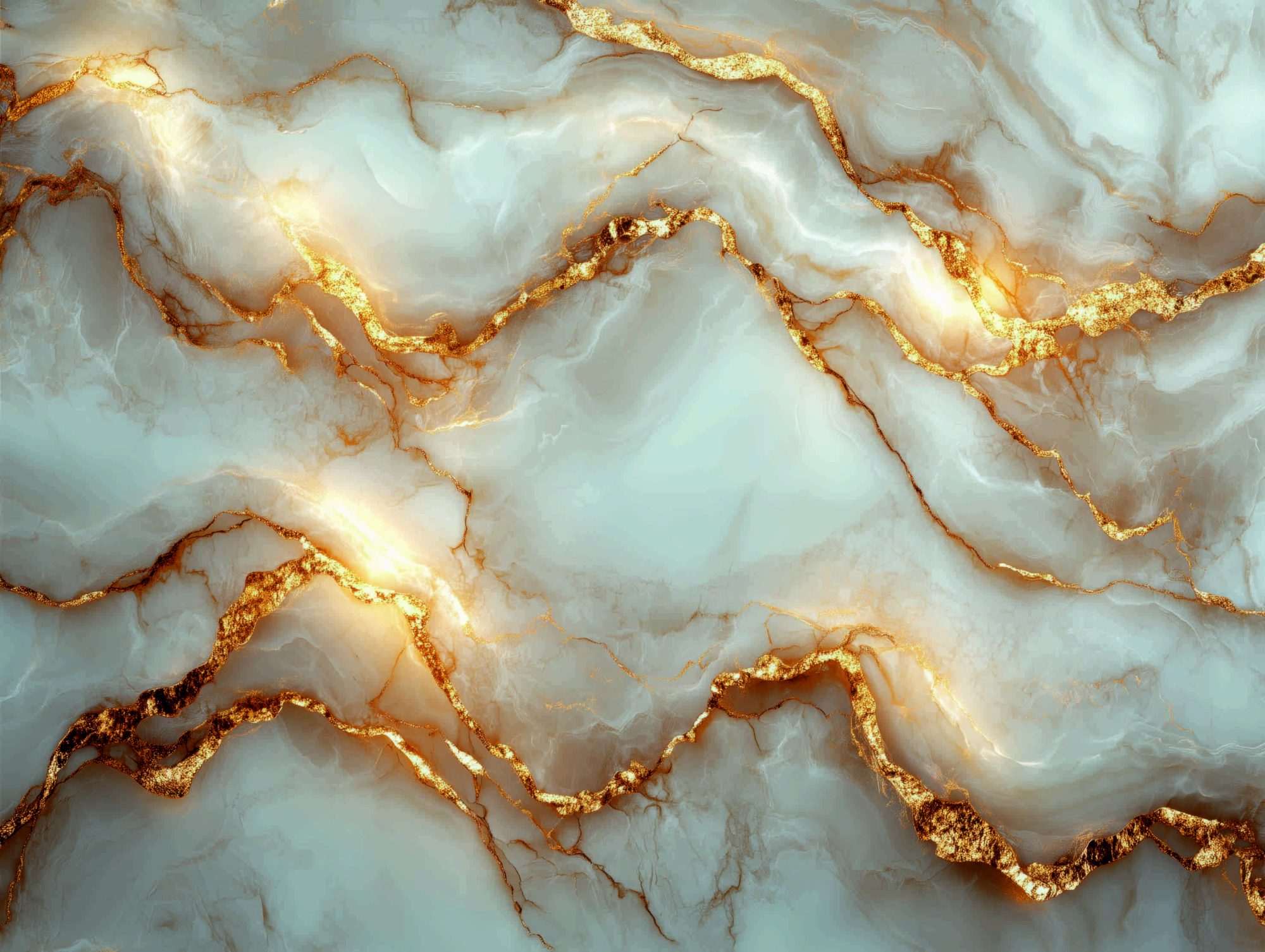Dit fotobehang wit marmer met brede gouden aders toont een natuursteenpatroon waarin lichte marmertinten en krachtige goudlijnen samenkomen. De compositie bestaat uit brede marmerlagen die in zachte golven door het oppervlak lopen. Door deze natuurlijke beweging ontstaat een patroon dat rust en elegantie uitstraalt.