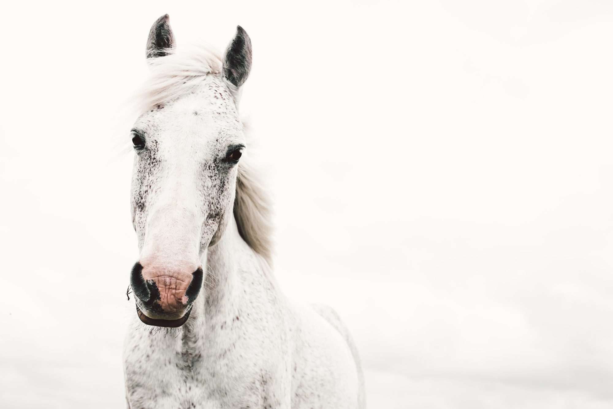 Het fotobehang wit paard lichte achtergrond geeft een elegante en moderne uitstraling aan de ruimte. Ideaal voor slaapkamer of woonkamer.