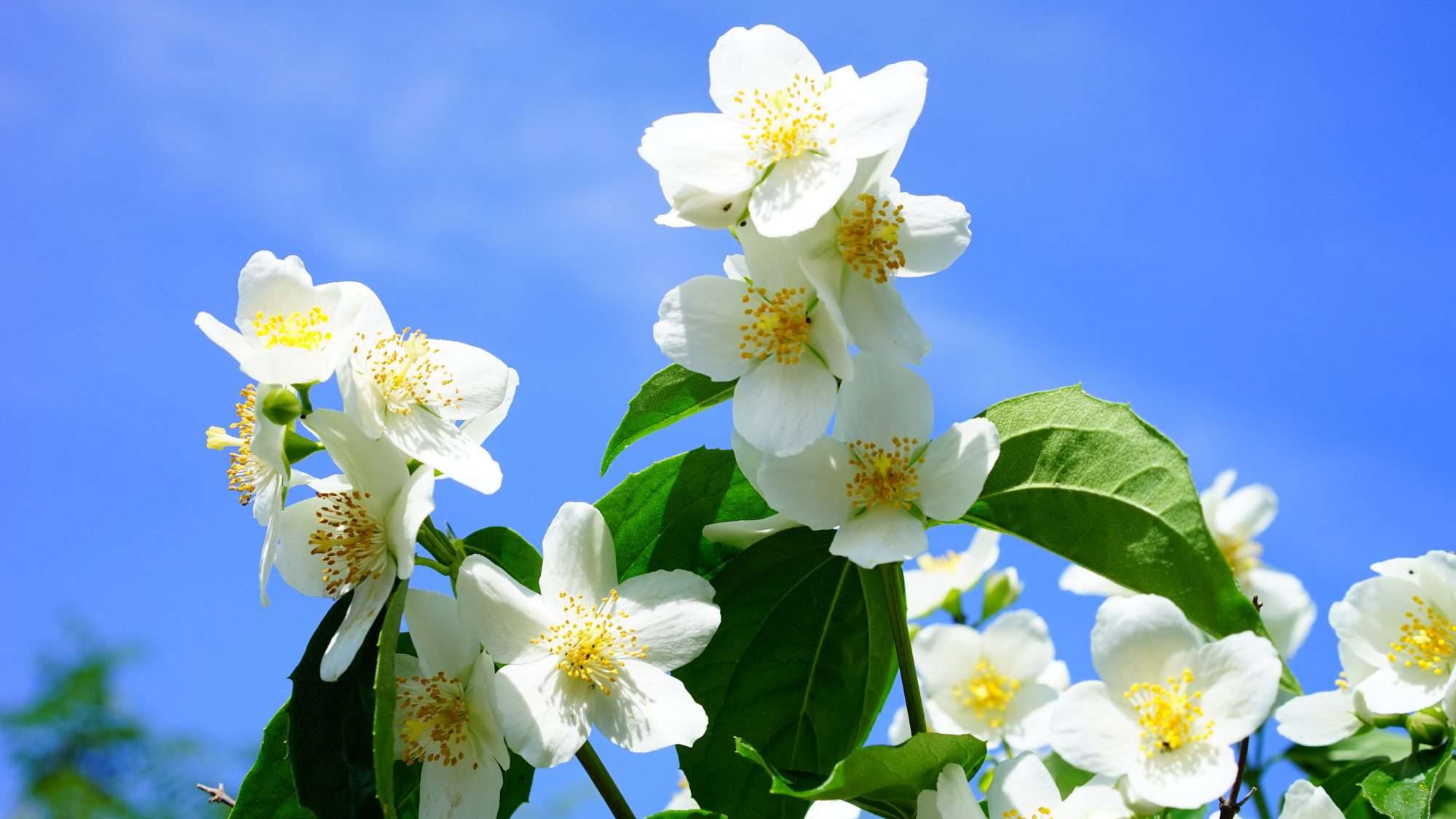 Dit fotobehang witte jasmijnbloemen toont een bloeiende tak jasmijn die zich tegen een heldere blauwe lucht aftekent. De compositie laat meerdere open bloemen zien die zich aan een groene tak ontwikkelen. Door de lichte achtergrond krijgt het beeld een open en luchtige uitstraling waarin de bloemen duidelijk naar voren komen.