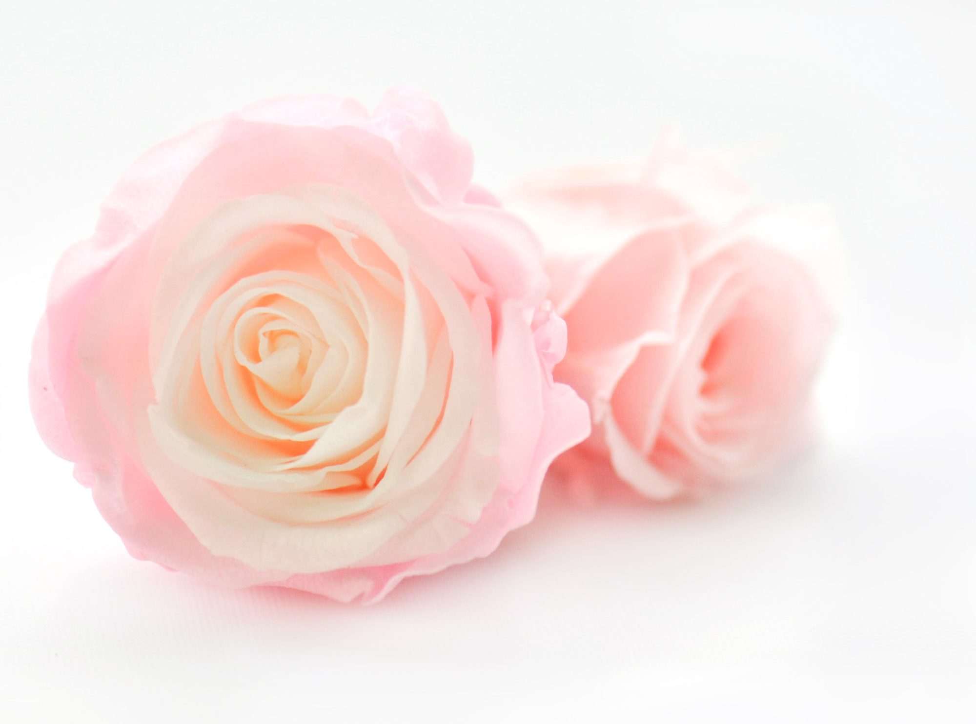 Dit fotobehang pastel witte rozen toont twee rozen die op een lichte achtergrond liggen. De compositie is minimalistisch waardoor de bloemen volledig tot hun recht komen.