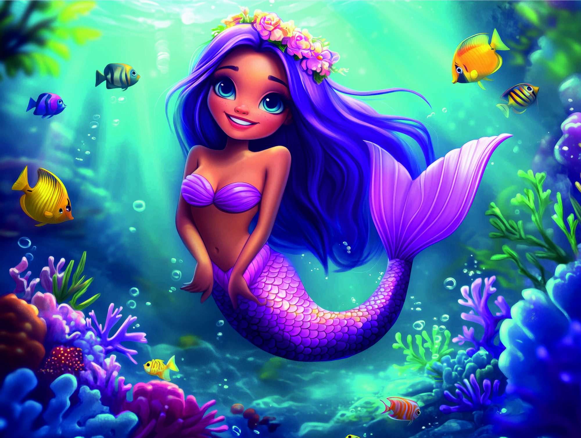Het kleurgebruik is rijk en gevarieerd, met diepe blauwtinten, paarse accenten en levendige kleuren in het koraal. Deze combinatie zorgt voor een dynamisch beeld dat toch in balans blijft door de vloeiende overgangen tussen de tinten. De zeemeermin vormt een visueel middelpunt door haar contrasterende kleuren.